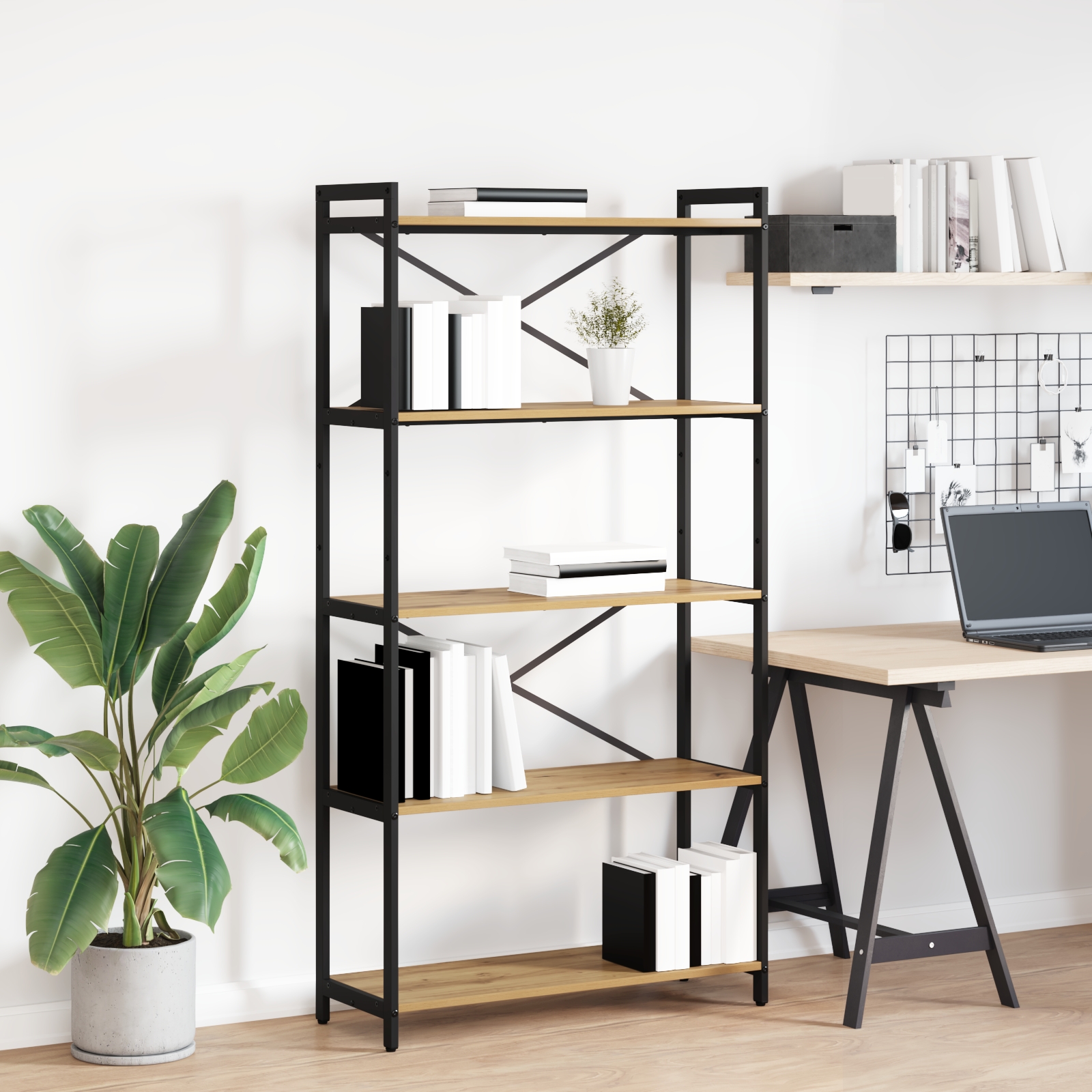- Stocare Generoasă: Având mai multe rafturi, acest raft îți oferă mult spațiu pentru cărți și decorațiuni. Poți fi creativ și să îți aranjezi lucrurile cum vrei. Indiferent dacă depozitezi o bibliotecă întreagă sau expui suveniruri, designul etajat păstrează totul ordonat și stylish.