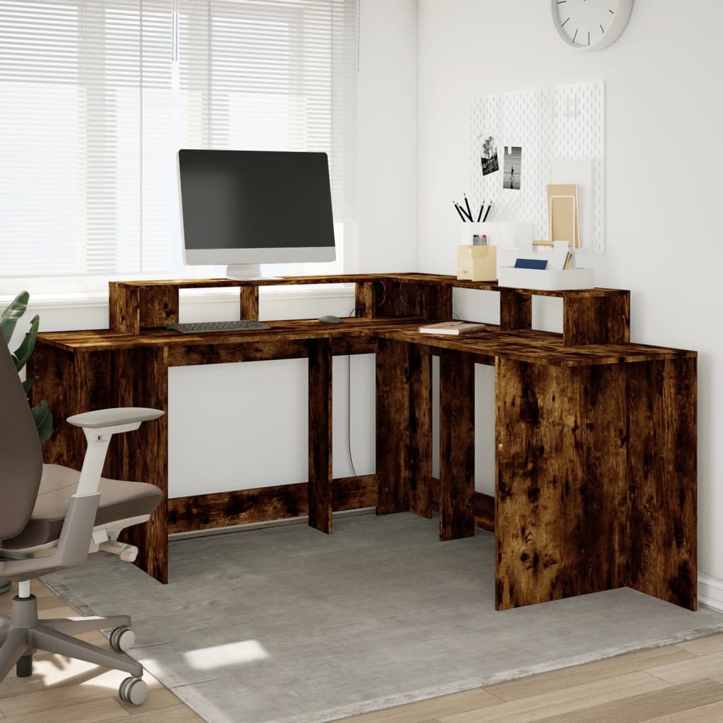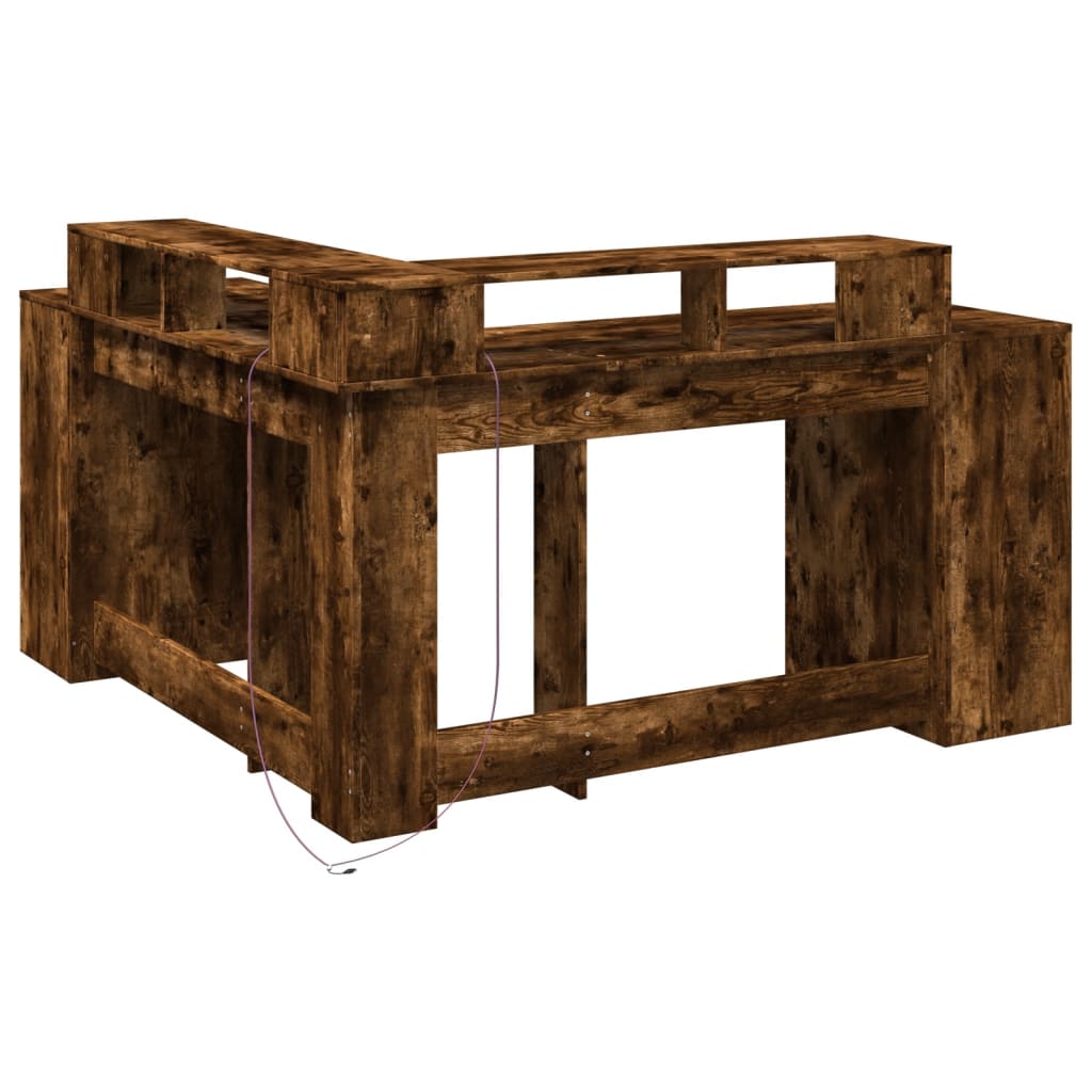 Birou cu lumini LED stejar fumuriu 152x152x91 cm lemn prelucrat