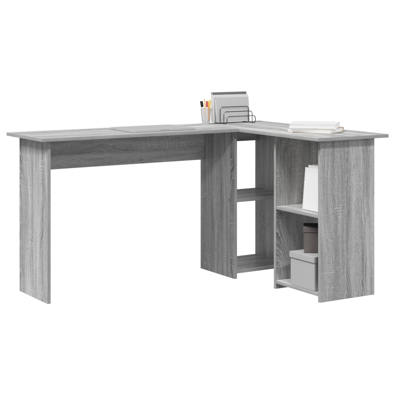- Depozitare Spațioasă: Cu rafturi din lemn ingineresc, masa de colț răspunde bine nevoilor de stocare, oferindu-ți loc suficient pentru caiete, fișiere sau chestii decorative. Rafturile sunt solide și susțin esențialele personale și profesionale, menținând biroul organizat.