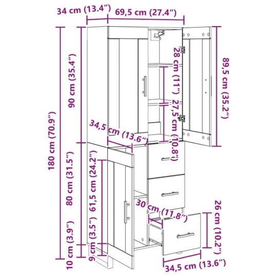 - 1 x Comodă: 69,5 x 34 x 90 cm(LxWxH)