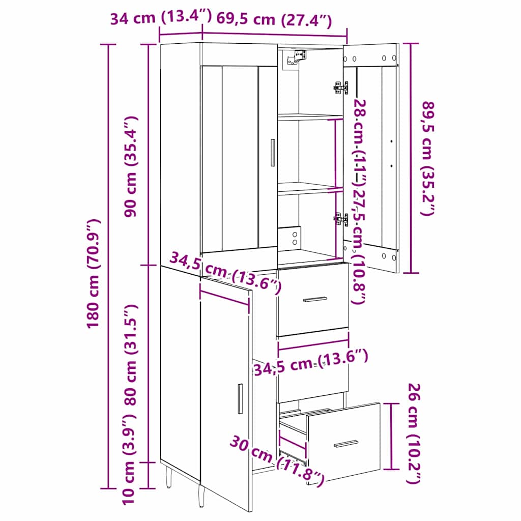 - 1 x Comodă: 69,5 x 34 x 90 cm(LxWxH)