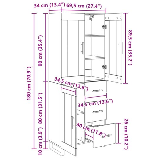 - 1 x Comodă: 69,5 x 34 x 90 cm(LxWxH)