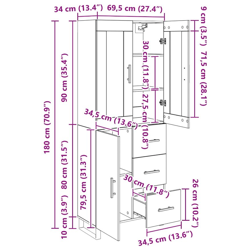 • 1 x Comodă: 69,5 x 34 x 90 cm(LxWxH)