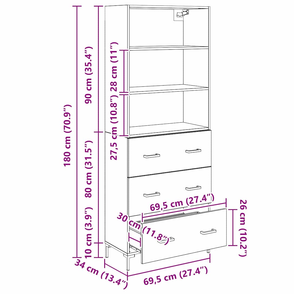- 1 x Comodă: 69,5 x 32,5 x 90 cm (LxWxH)