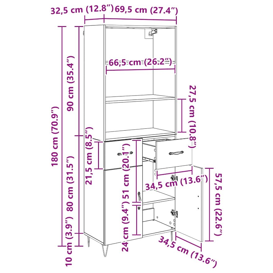 • 1 x Blat pentru highboard: 69.5 x 32.5 x 90 cm (LxWxH)