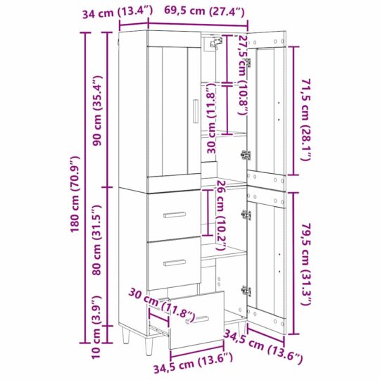 - 1 x Dulap lateral: 69.5 x 34 x 90 cm (LxWxH)