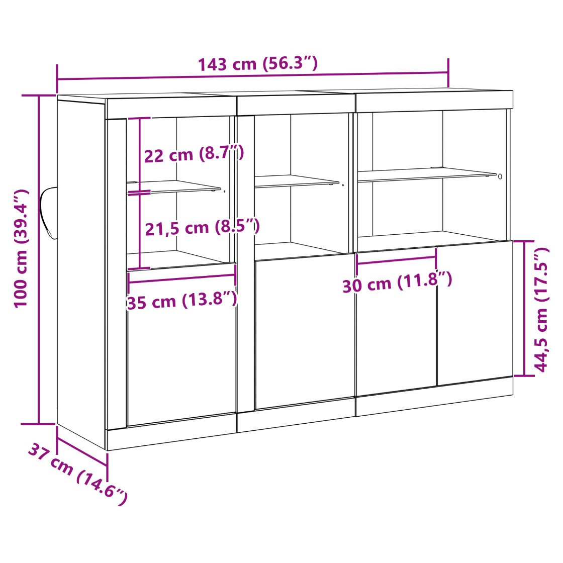 • Depozitare Generoasă: Bufetul are o mulțime de spațiu, cu compartimente mari pentru a stoca lucrurile de servit sau orice altceva ai nevoie. Ușile și rafturile sunt plasate bine, așa că ai totul la îndemână fără să fie haos.