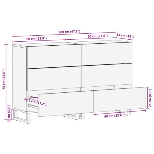- Construcție din lemn masiv de mango: Sideboardul e realizat din lemn masiv de mango, cunoscut pentru forța și frumusețea sa naturală. E solid și durabil, iar textura unică adaugă un plus de caracter spațiului tău.