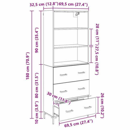 • 1 x Dulap superior: 69,5 x 32,5 x 90 cm (LxWxH)