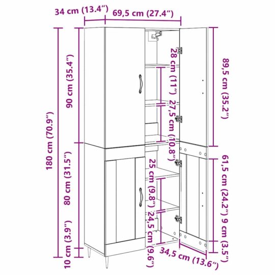 - Pachet complet: Se livrează în două părți: un sideboard de 69,5 x 34 x 90 cm și o componentă superioară pentru dulapul înalt, care reflectă măsurile astea. Împreună, formează o soluție de stocare eficientă, maximizând utilitatea în spații mici.