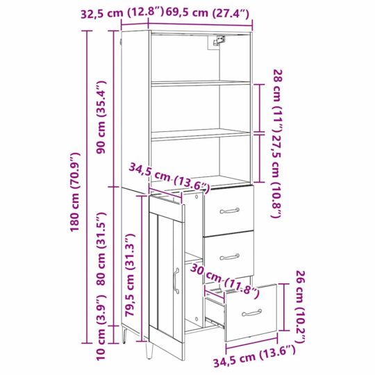 - 1 x Sideboard: 69.5 x 34 x 90 cm (LxWxH)