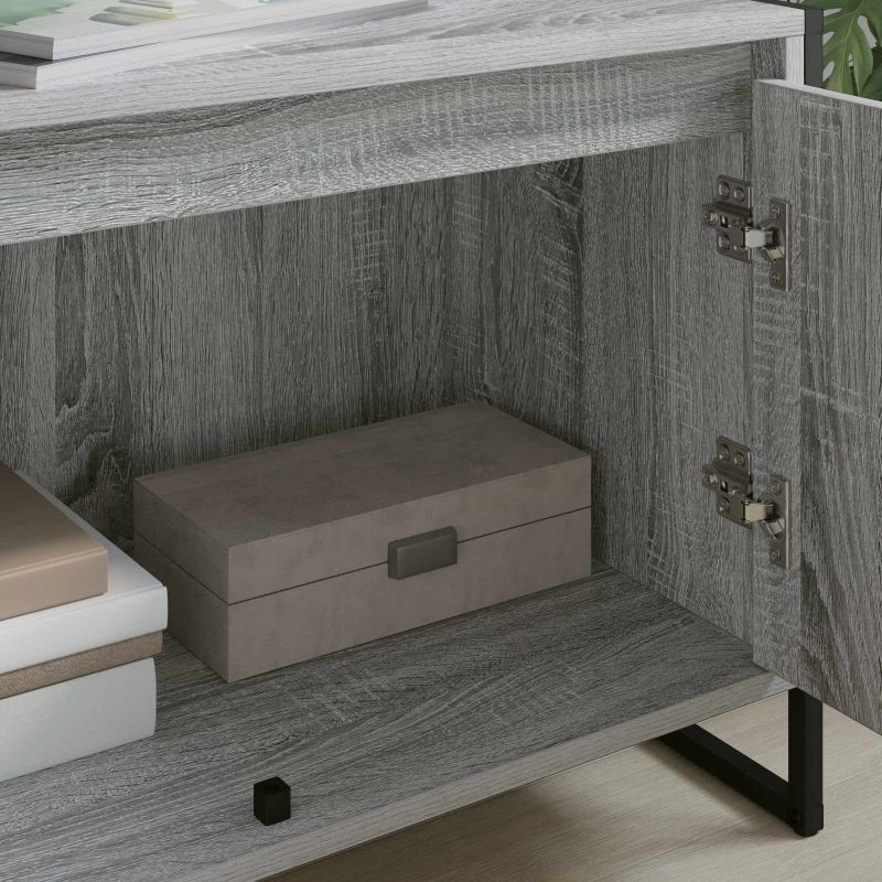 Acest cabinet TV îmbină stilul modern cu cel industrial, integrându-se ușor în orice sufragerie. Lemnul prelucrat și designul rectangular îl fac nu doar atractiv, ci și funcțional, oferind suficiente opțiuni de stocare pentru diverse dispozitive media. Combinația de materiale asigură un look elegant și durabil, fiind perfect pentru cei care caută soluții de stocare stylish și robuste.