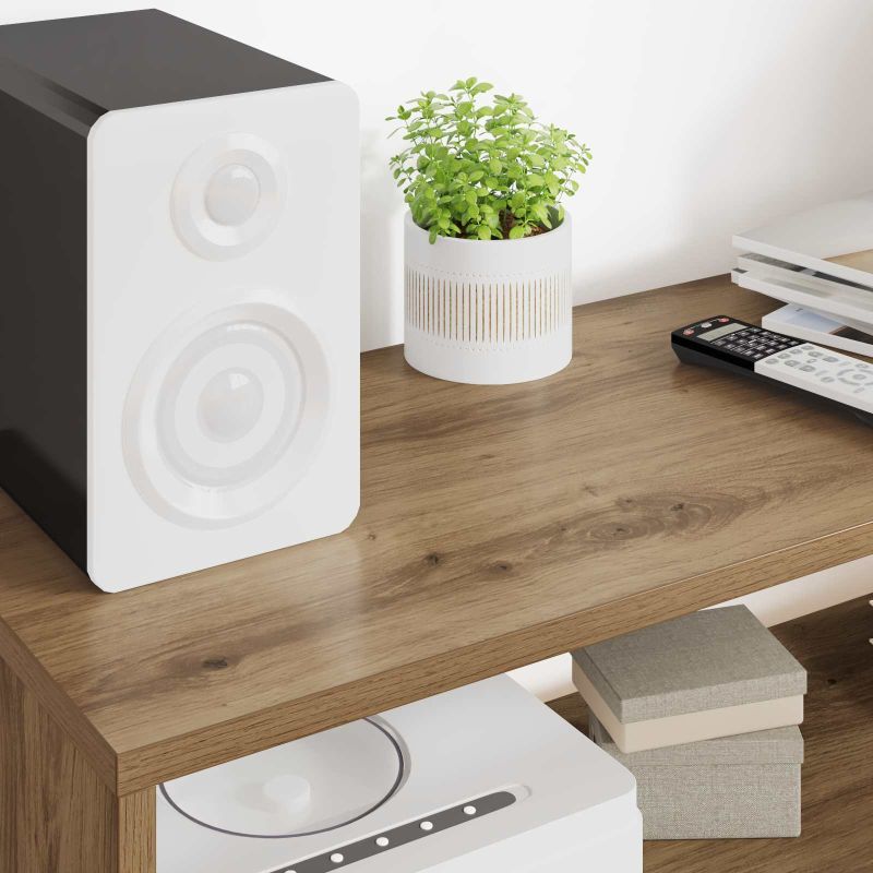 • Componente Incluse: Are rafturi din lemn care ajută să pui la punct toate gadgeturile media și decorurile. Fiecare raft e rezistent și poate suporta greutăți, așa că e perfect pentru console de divertisment și sisteme audio. E ideal pentru casele care iubesc tehnologia.