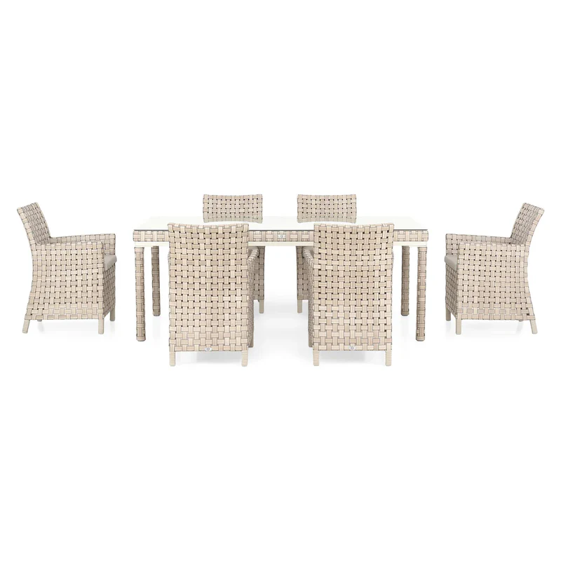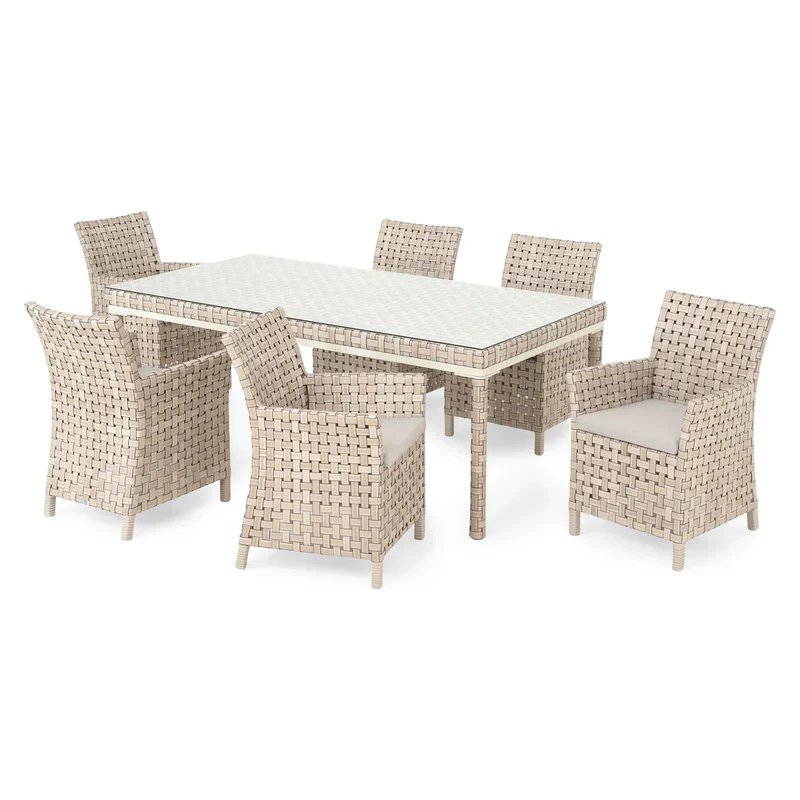 Set mobilier terasă/grădină, 6 scaune și masă Cielo. Decorați-vă terasa sau grădina cu ajutorul setului mobilier din gama Cielo și bucurați-vă de timp în aer liber alături de cei dragi. Setul este realizat din structură de aluminiu vopsită în câmp electrostatic și împletită cu fibre sintetice Vyro cu protecție UV. Scaunele includ perne îmbrăcate în țesătură Olefin Sunproof cu protecție împotriva umezelii și a razelor UV. Husele sunt prevăzute cu fermoar pentru a fi mai ușor de îndepărtat și curățat. Topul mesei este realizat din sticlă securizată, ceea ce îi conferă rezistență la șocuri și durabilitate. Designul setului este unul natural, acesta contribuind la decorarea unei terase sau grădini într-un mod elegant.