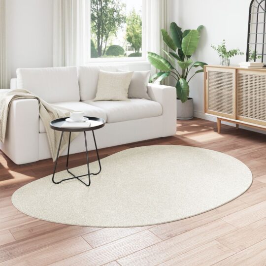 Acest covor oval crem aduce eleganță în decorul tău și se potrivește cu stiluri moderne și clasice. Textura netedă și culoarea plăcută îl fac atât decorativ, cât și super confortabil, perfect pentru zonele de zi, dormitoare sau locuri cozy unde vrei să te relaxezi.