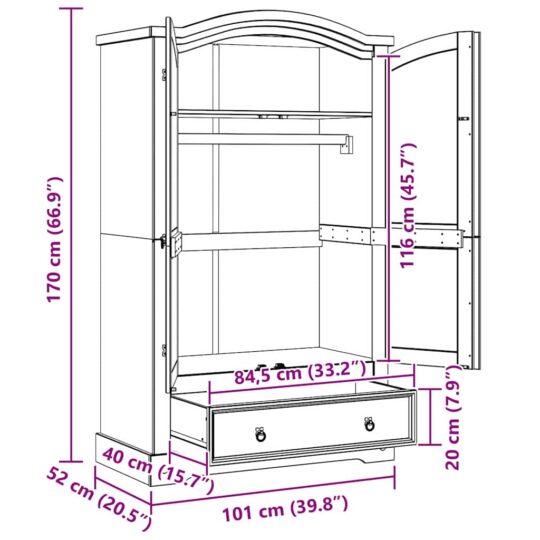 Acest dressing modern îmbină stocarea practică cu un design elegant, perfect pentru dormitorul sau spațiul de îmbrăcare. E făcut din lemn de pin masiv, iar construcția lui solidă se potrivește în orice stil de interior, oferind nu doar utilitate, ci și un plus de estetică în decor.
