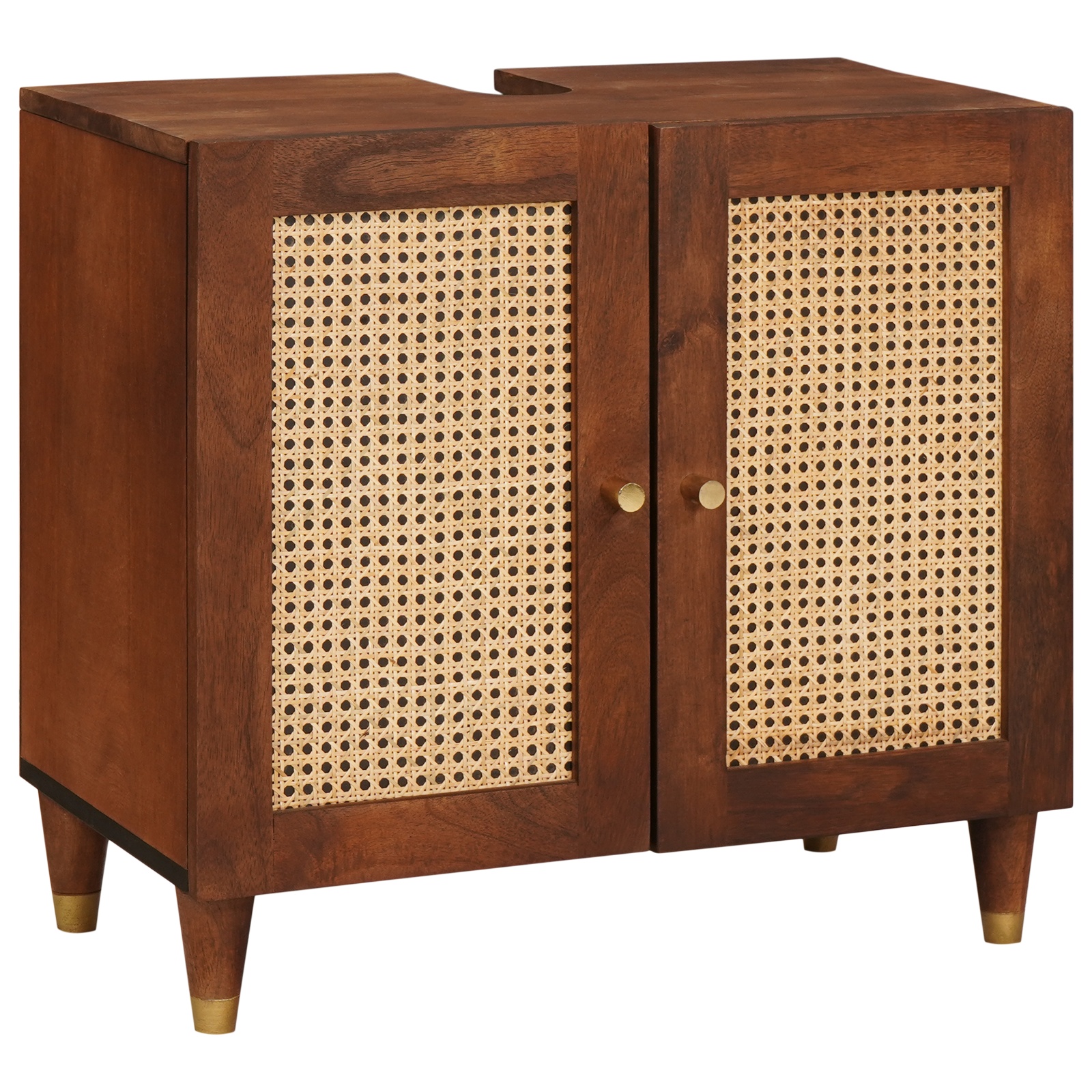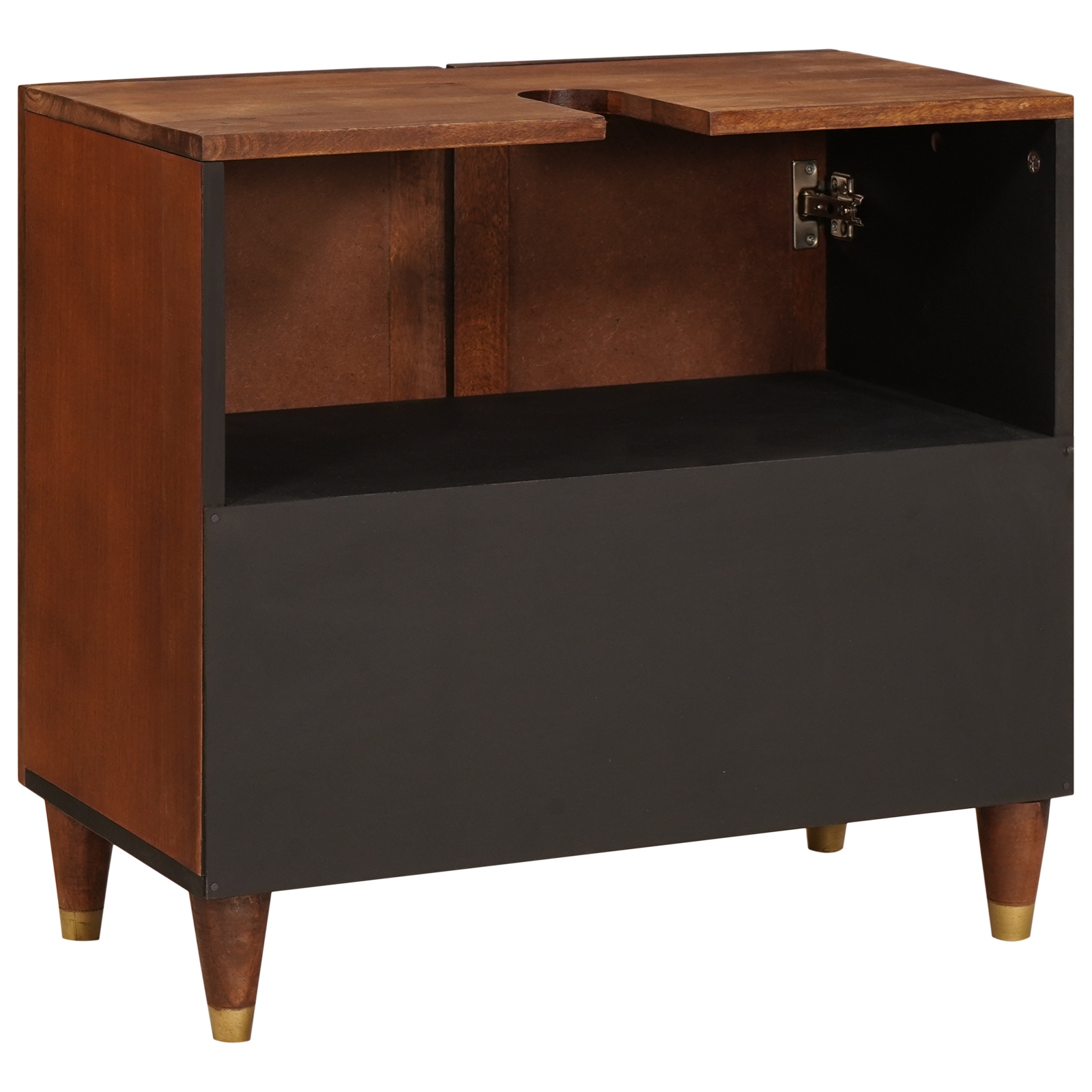 Material cu textură naturală: Dulapul pentru chiuvetă este construit din lemn masiv de mango, cunoscut pentru fibră și textura sa bogată, care contribuie la o piesă vizual atrăgătoare ce aduce căldură băii tale. Complementând materialul principal, lemnul prelucrat adaugă stabilitate structurală, făcându-l o alegere durabilă care combină valoarea estetică cu durabilitatea.,Componente incluse: Include uși și rafturi elegant concepute în nuanțe de brun, formând o unitate coerentă care se integrează perfect în orice decor de baie. Compartimentele oferă opțiuni diverse de depozitare, contribuind nu doar la soluții practice, ci și la îmbunătățirea aspectului estetic ritmic al unității.,Caracteristici funcționale: Acest dulap oferă un spațiu generos de depozitare, facilitând accesul ușor la compartimente pentru organizarea produselor de toaletă, prosoapelor și altor esențiale pentru baie. Designul său bine gândit pune accent pe elementele prietenoase cu utilizatorul, fără a compromite stilul, făcându-l o adăugare de încredere în casa ta.,Utilizare versatilă: Ideal pentru orice configurație de baie, acest dulap servește atât ca un element decorativ atractiv, cât și ca o soluție practică pentru nevoile de depozitare. Este perfect pentru proprietarii care caută versatilitate și soluții practice într-un pachet stylish, integrându-se perfect cu diverse stiluri de design interior.,Necesită minim de îngrijire: Proiectat pentru a fi ușor de întreținut, acest dulap poate fi păstrat la aspectul său impecabil pur și simplu prin ștergerea cu o cârpă uscată. Exteriorul său cu întreținere redusă asigură o atractivitate de lungă durată, făcându-l o soluție convenabilă pentru cei care apreciază atât stilul, cât și confortul.