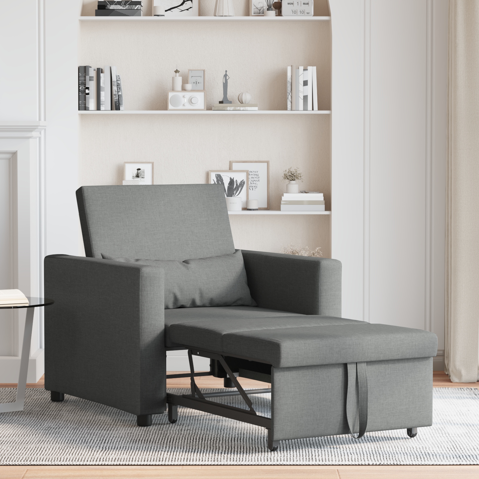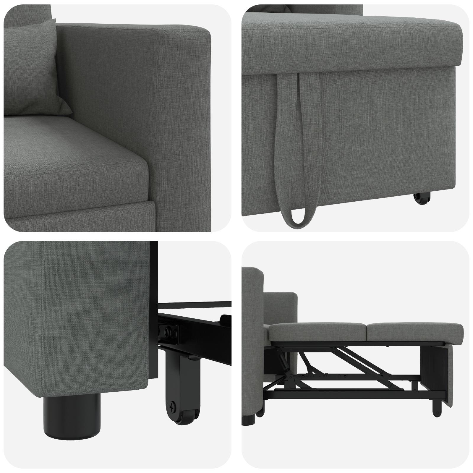 - Funcționalitate Convertibilă 3 în 1: Schimbările sunt floare la ureche cu canapeaua asta, care se transformă șmecher între fotoliu, șezlong și, în final, pat. Multifuncționalitatea ei o face perfectă pentru spațiile mici, maximizând confortul.
