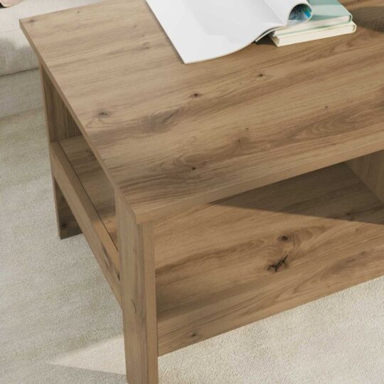 - Rafturi din lemn rezistent: Sub blatul mesei, rafturile acesteia îți oferă extra spațiu de depozitare. Poți folosi rafturile pentru a organiza reviste, cărți sau telecomenzi, maximizând spațiul din living fără a compromite stilul.