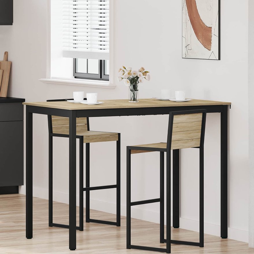 • Materiale solide: Masa e din lemn prelucrat, așa că e rezistentă și arată bine. Picioarele și cadrul metalic sunt robuste, asigurând stabilitate și un design elegant.