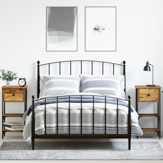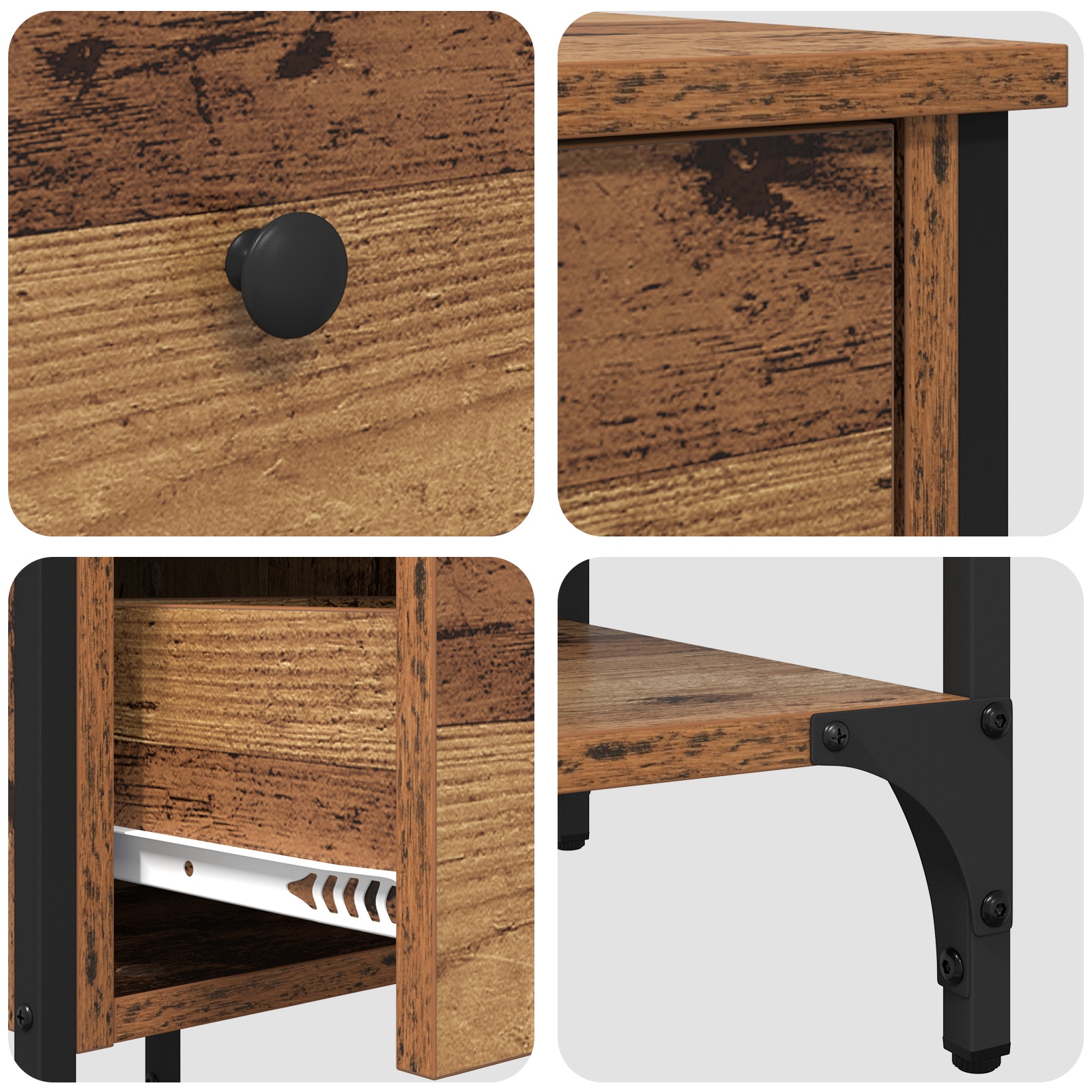 Setul ăsta de două noptiere se mândrește cu un finisaj superb din lemn vechi și un cadru elegant din metal negru. Ai un sertar încăpător și două rafturi netede pentru depozitare comodă.