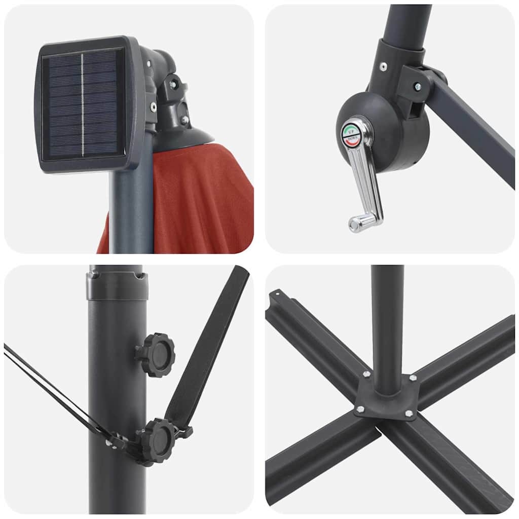 - LED-uri cu Energie Solară: Creat pentru plăcerea serii, acest parasol include iluminare LED strălucitoare și prietenoasă cu mediul, alimentată de energie solară. Indiferent dacă organizezi o cină în grădină sau o conversație în timpul nopții, atmosfera călduroasă creată îmbunătățește orice experiență în aer liber pe timp de noapte.