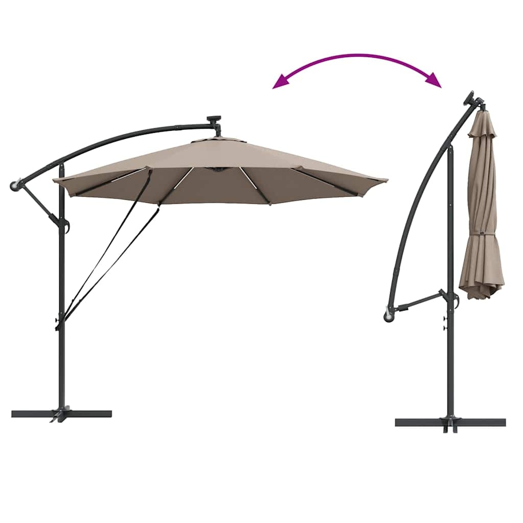 - Iluminare Solară Ecologică Iluminează-ți întâlnirile de seară cu LED-urile integrate alimentate solar, situate pe fiecare aripă a parasolarului. Aceste lumini eficiente energetic oferă o atmosferă fermecătoare, permițându-ți să îți extinzi plăcerea în aer liber în noapte cu un impact minim asupra mediului.