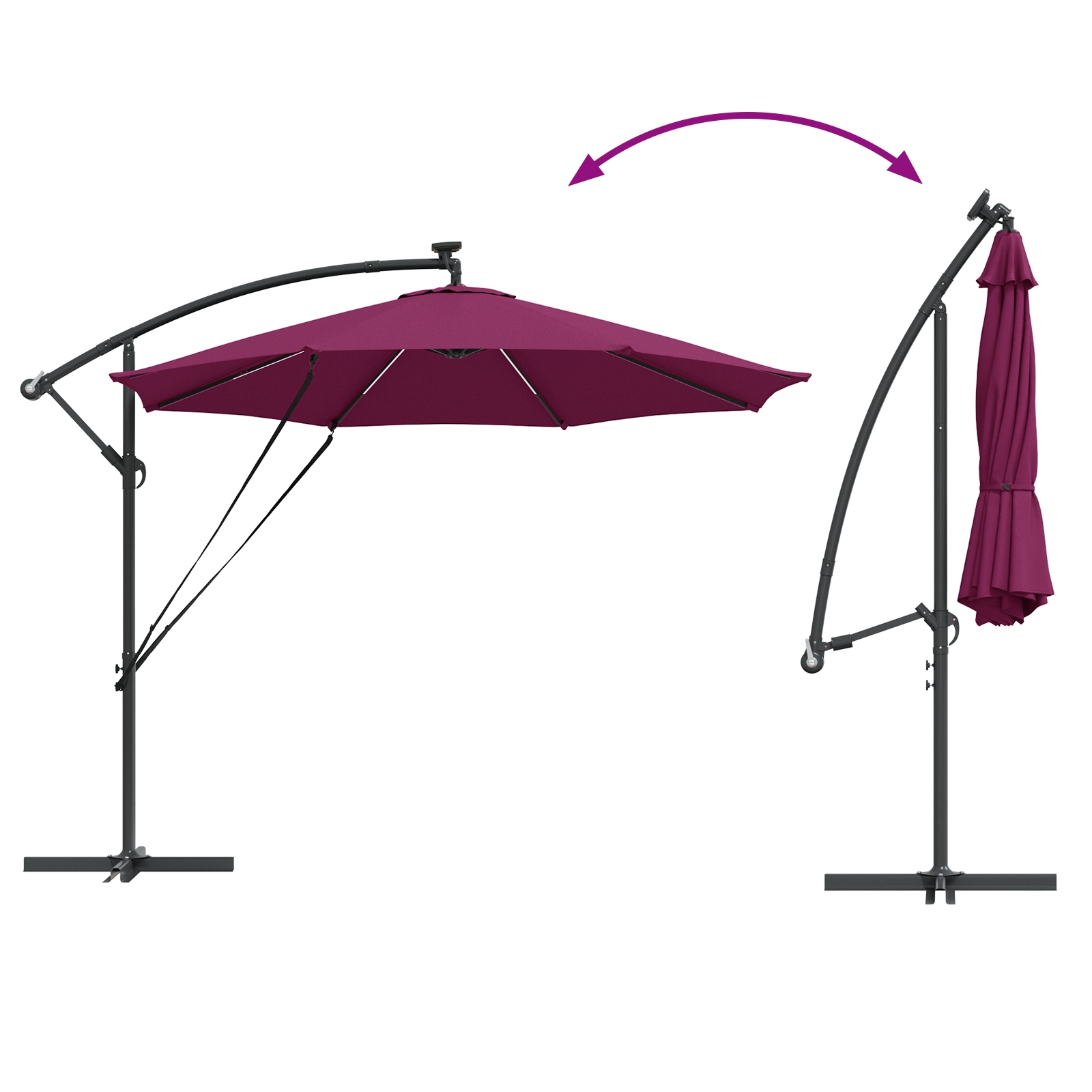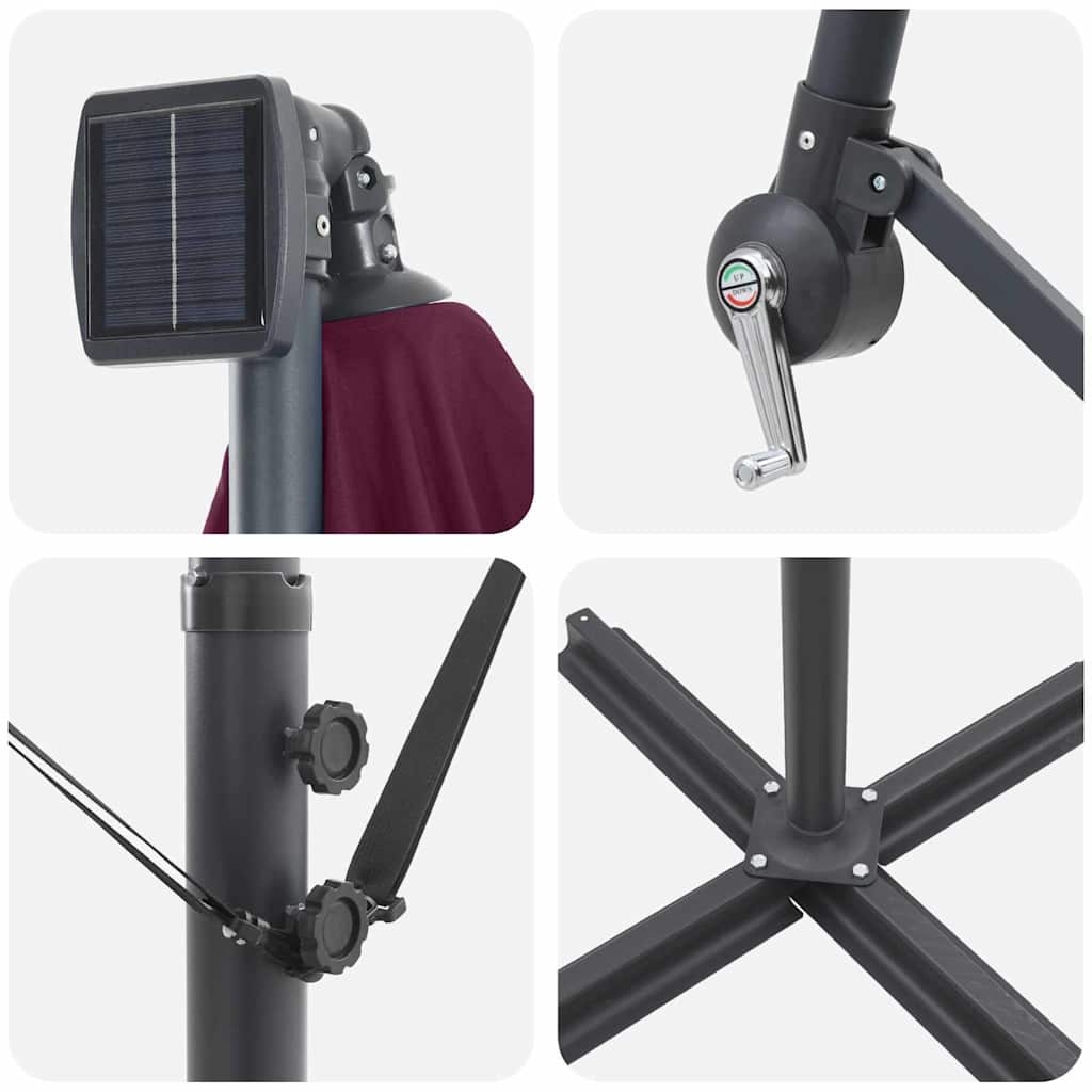 - Iluminare Solară Ecologică Iluminează-ți întâlnirile de seară cu LED-urile integrate alimentate solar, situate pe fiecare aripă a parasolarului. Aceste lumini eficiente energetic oferă o atmosferă fermecătoare, permițându-ți să îți extinzi plăcerea în aer liber în noapte cu un impact minim asupra mediului.