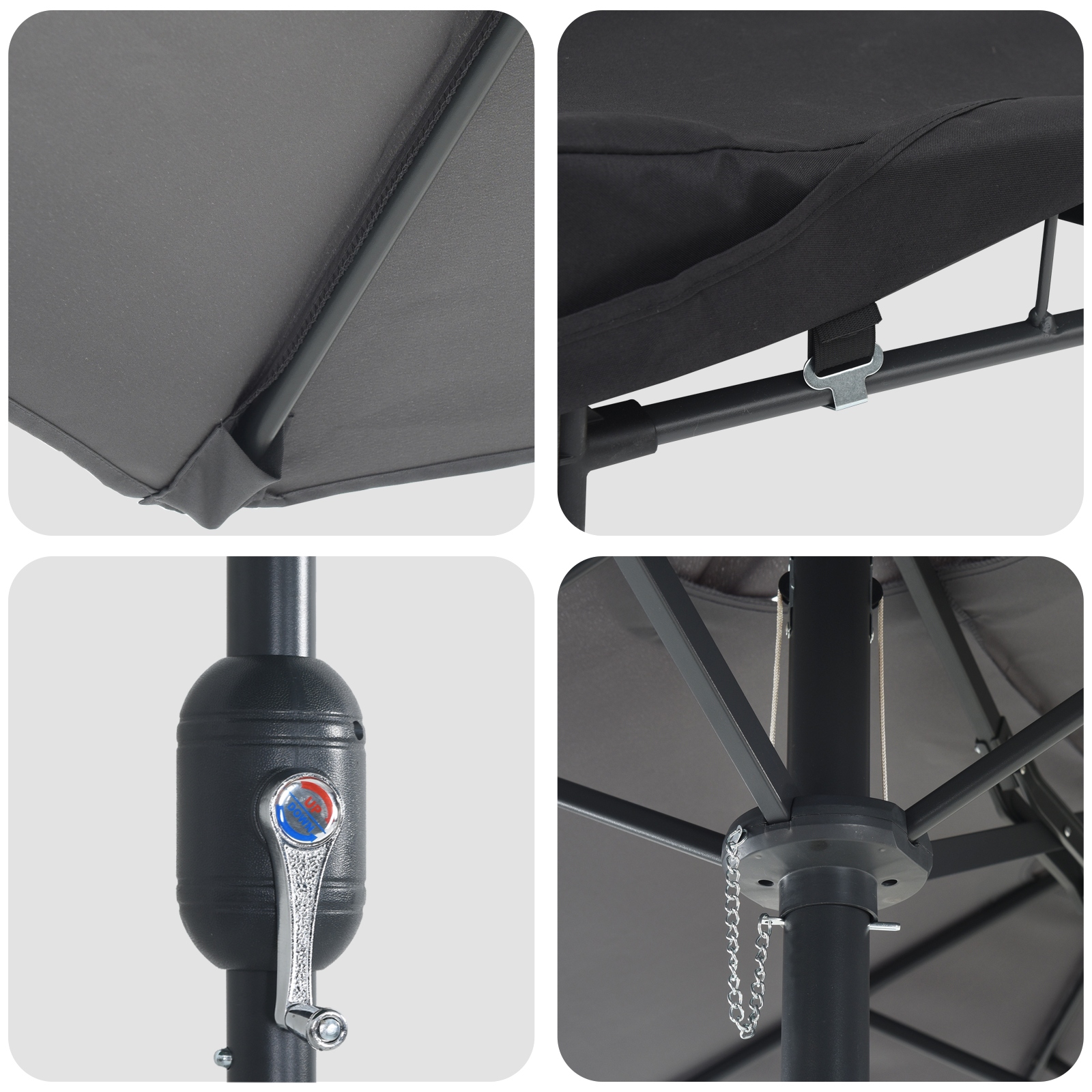 - Funcționalitate ridicată: Parasolul este echipat cu o manivelă netedă, permițându-ți să-l deschizi și să-l închizi cu ușurință, fără niciun fel de bătaie de cap. Această caracteristică funcțională oferă o gestionare convenabilă a umbrelei, asigurând un setup rapid și un depozit sigur, făcându-l ideal pentru persoanele care apreciază eficiența și ușurința de utilizare.