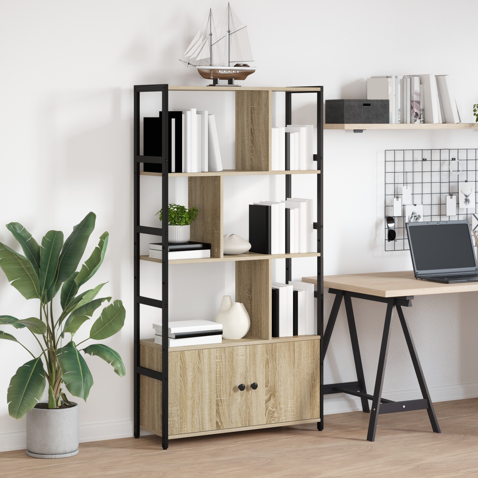 Raftul ăsta funky e exact ce ai nevoie pentru stocare în living sau birou. Cu designul său chic pe niveluri, oferă spații pentru tot ce ai nevoie, fie că-s cărți sau obiecte decorative – e un must-have pentru cei care apreciază stilul. Construcția solidă din oțel și lemn lucrat promite durabilitate, iar picioarele reglabile îl fac super practic pe orice tip de podea.