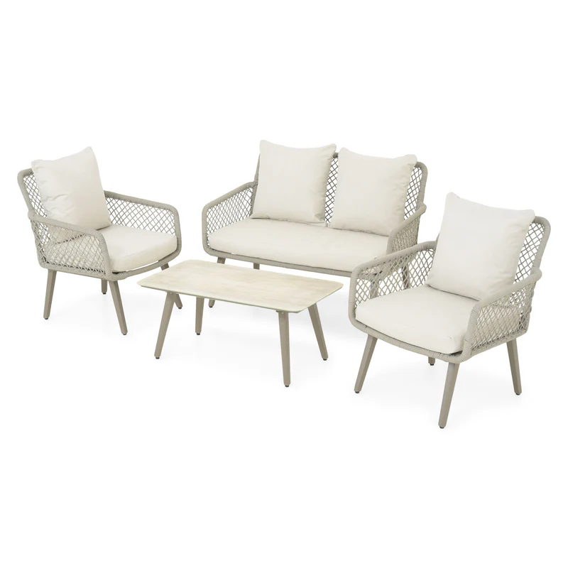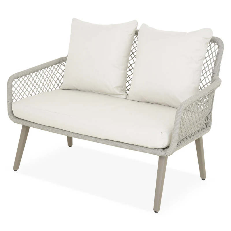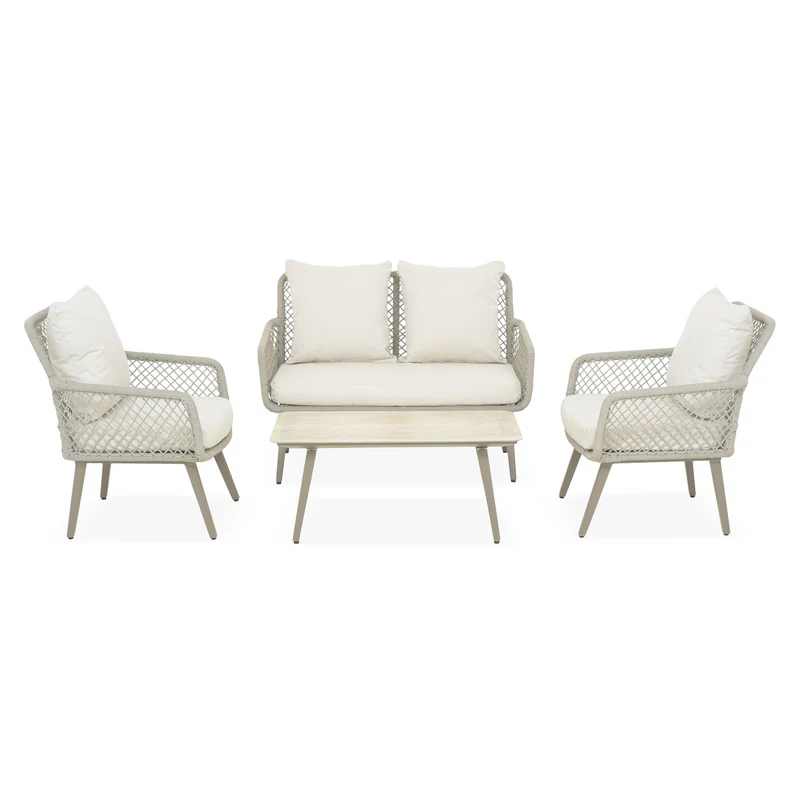 Set mobilier terasă/grădină, 2 fotolii, canapea și masă Rennes. Zilele călduroase de vară se pot îmbunătăți considerabil prin utilizarea unui set de mobilier de terasă/grădină Rennes. Amplasându-l pe spațiul vostru exterior, acesta îl completează atât funcțional, cât și estetic. Realizat din structură de aluminiu vopsită în câmp electrostatic, setul este rezistent și durabil timp îndelungat. Latura estetică este asigurată de împletitura cu fibre din textilină ce imită funia, rezistentă la razele UV. De asemenea, setul include perne din poliester cu protecție împotriva umezelii și a decolorării. Topul mesei este realizat din ceramică.