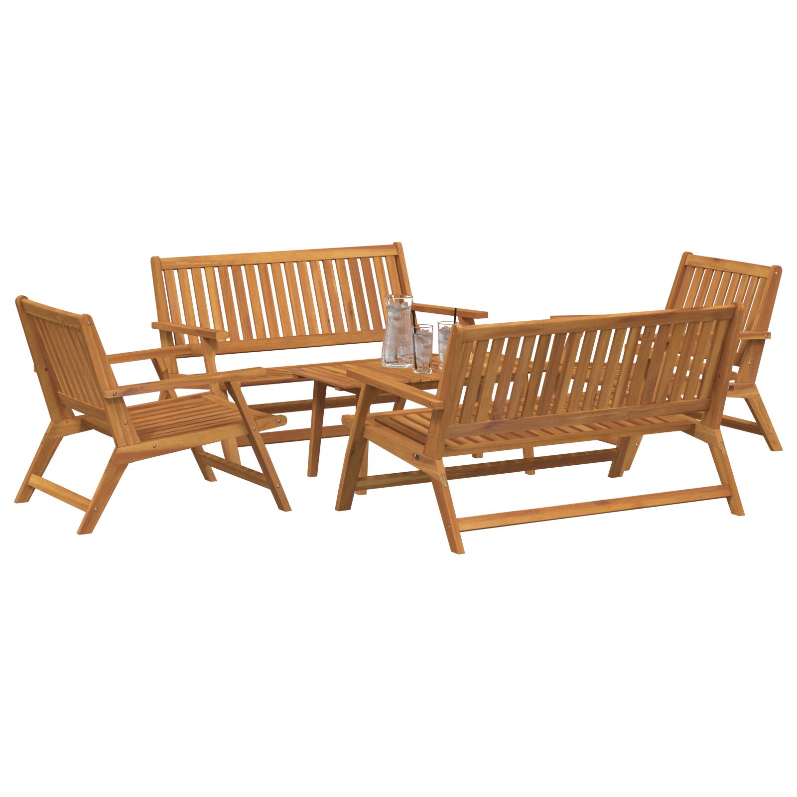• Lemn de acacia durabil: Setul e construit din lemn solid de acacia, promițând robustețe și capacitate de 110 kg per loc, rezistând la vreme.