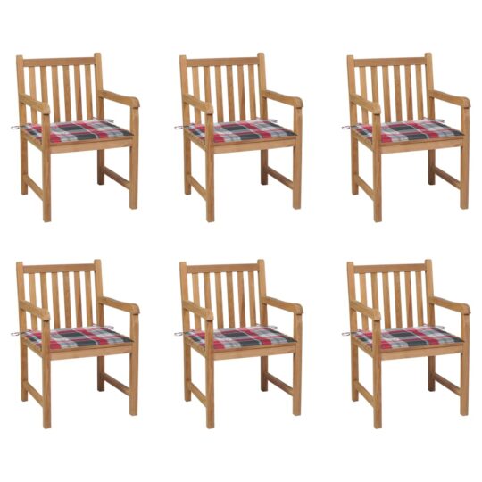 Scaune grădină cu perne, 6 buc, roșu, carouri, lemn masiv tec