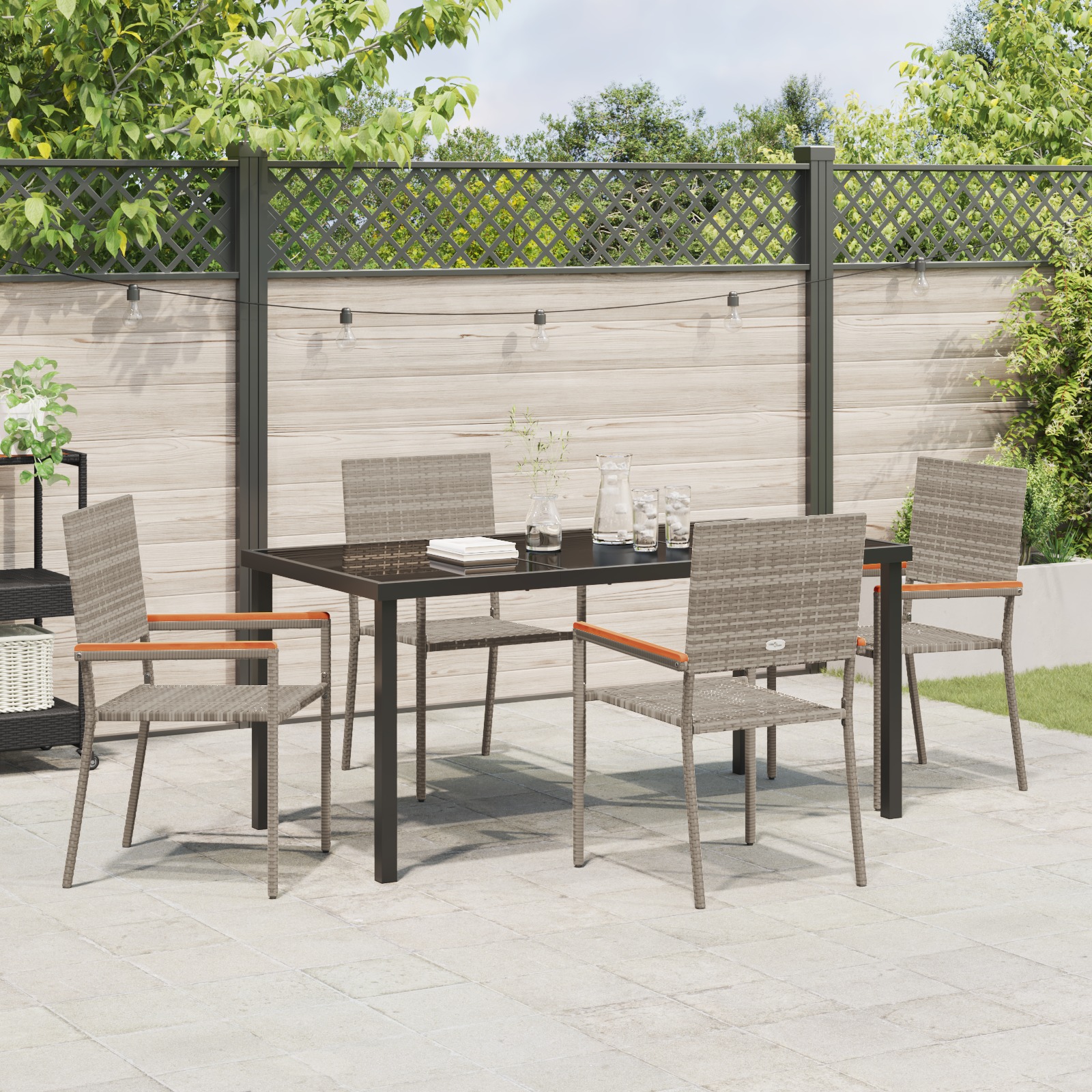 - Componente Incluse: Fiecare piesă de mobilier are spătare din poliratan, cadre din oțel și mese din sticlă securizată, ca să arate bine și să fie durabile. Cotierile din lemn masiv de acacia adaugă un pic de farmec și oferă suport.