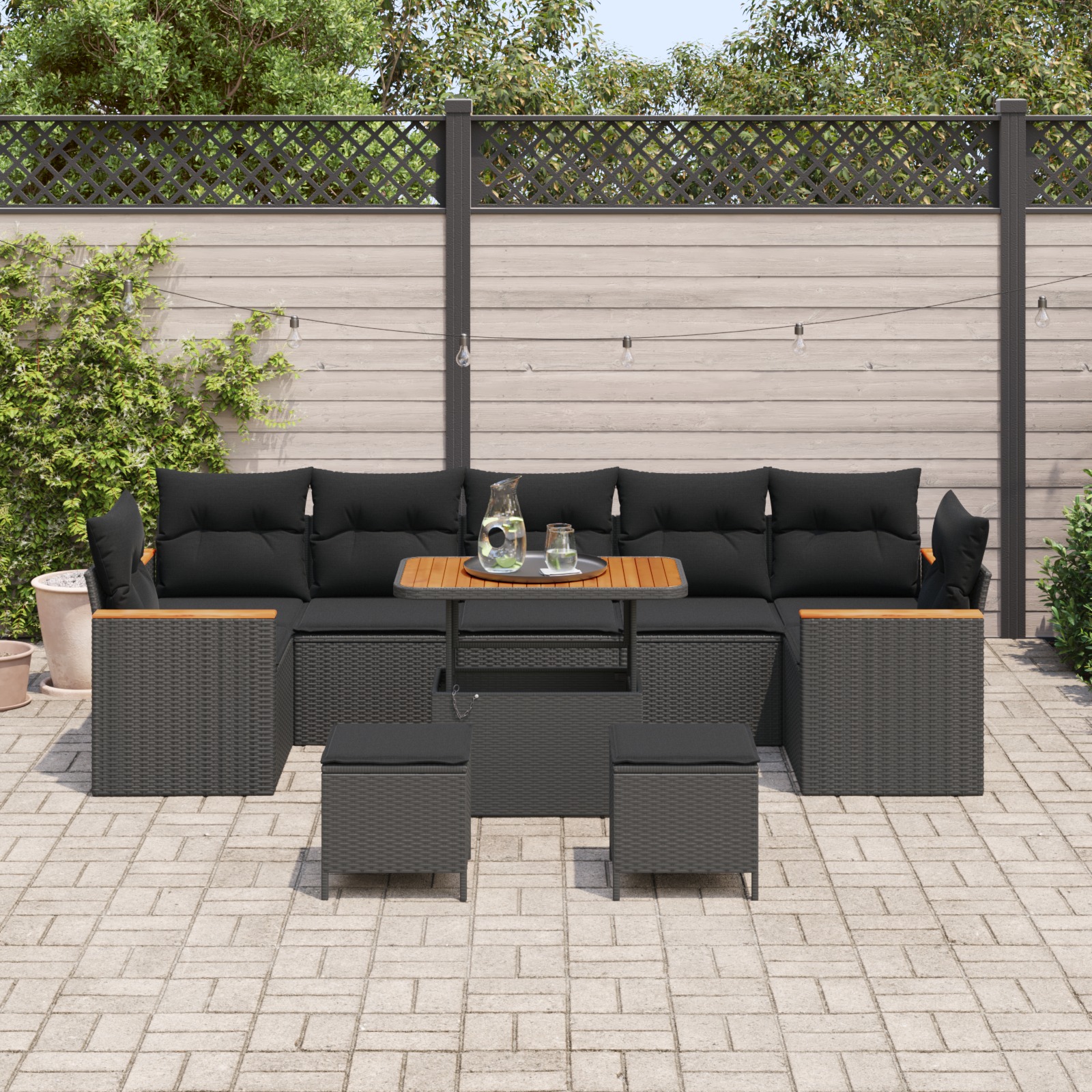 - Componente adaptabile Are 4 canapele cu brațe și 3 fotolii centrale, fiecare modul având un spațiu de depozitare sub scaun cu o geantă rezistentă la apă. Acest design bine gândit nu doar că optimizează utilitatea, dar îți menține esențialele la îndemână și ferite de intemperii. O masă din lemn de acacia solidă completează setul, oferind o suprafață robustă și chic pentru mese în aer liber sau băuturi relaxate.