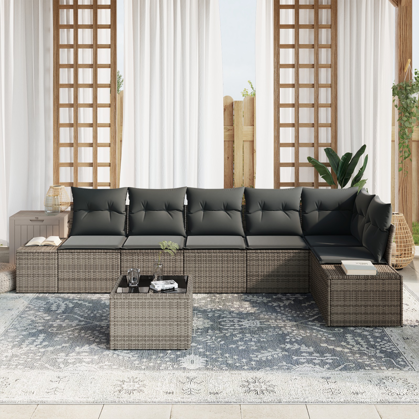 Setul ăsta de canapele pentru grădină e modular, punând accent pe funcționalitate și stil. Are un design modern cu linii clare și un vibe minimalist, fiind un element central trendy pentru grădina ta sau terasă. Împletitura și materialele rezistente la UV fac față vremii capricioase din primăvară și vară. Relaxează-te confortabil și transformă-ți spațiul exterior într-un loc de liniște, perfect pentru a-ți distreaza prietenii.