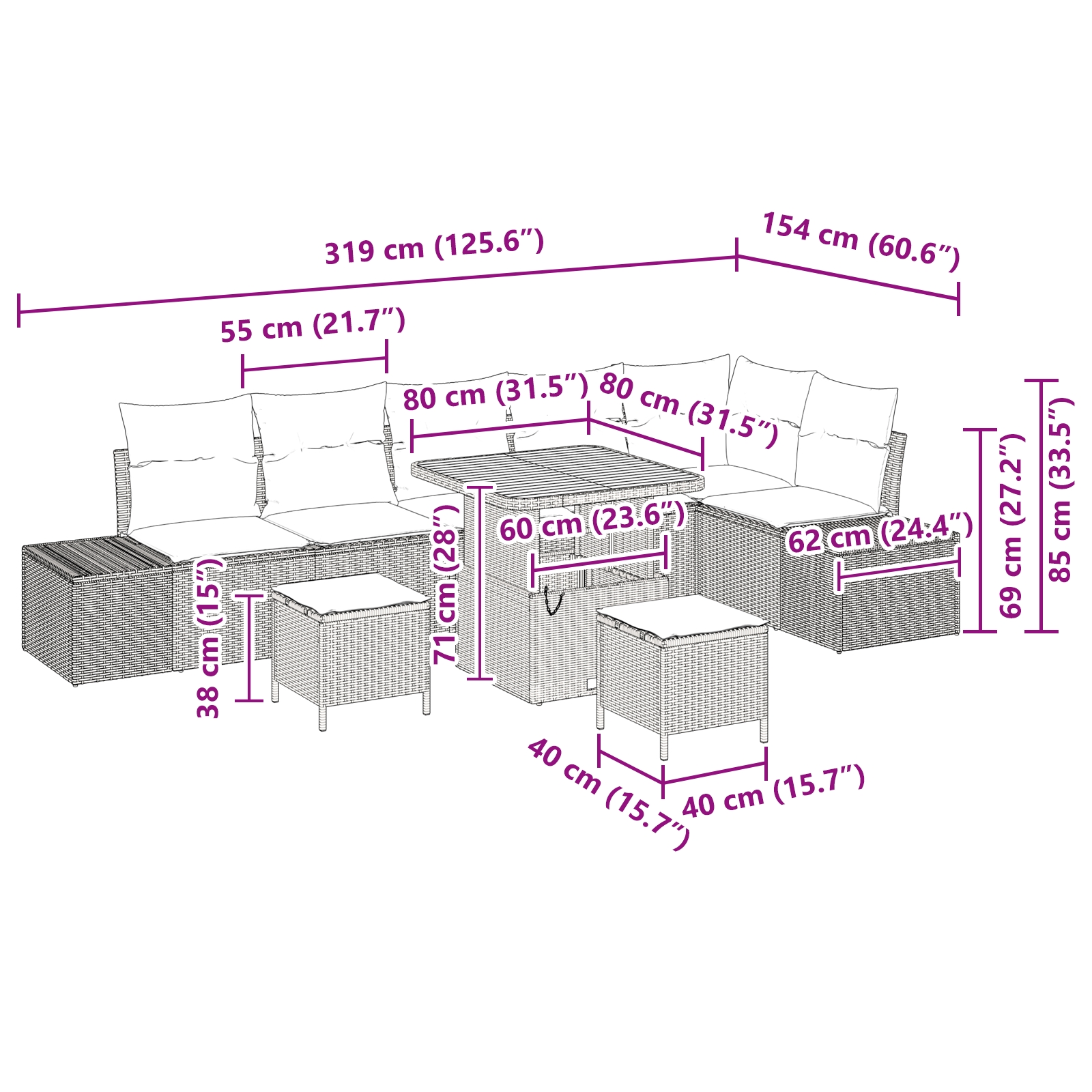 - Întreținere și Mentenanță: Foarte simplu de îngrijit – doar șterge-l cu o cârpă umedă ca să rămână curat. Scoate husele pernelor și adu-le înăuntru când vremea devine proastă. Setul e făcut pentru întreținere ușoară, asigurându-se că arată tare bine chiar mult timp.