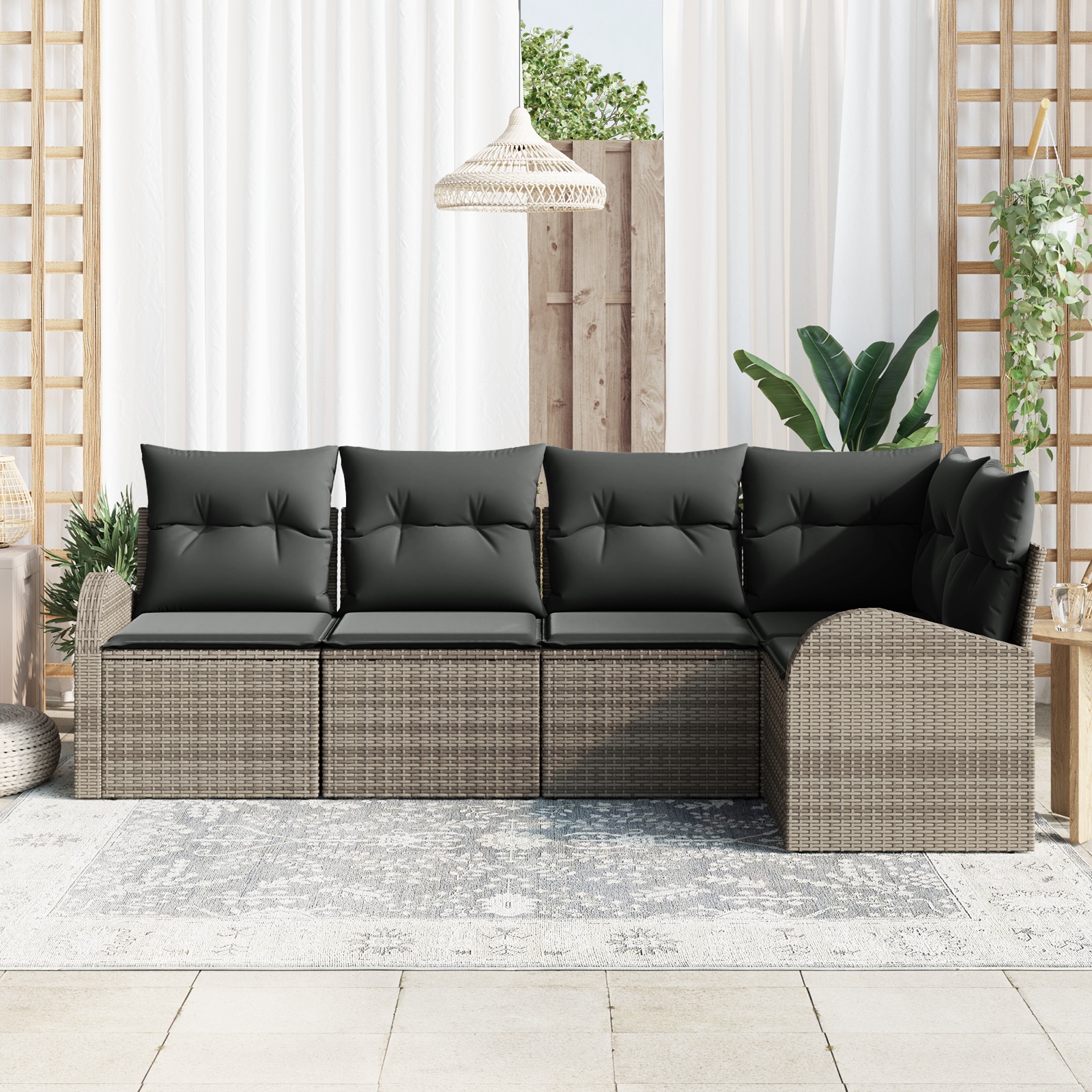 • Materiale: Fabricat din poliratan de calitate, setul ăsta de canapele e făcut să dureze și are un aspect elegant împletit. Rezistă la razele UV, așa că își păstrează frumusețea sezon după sezon.