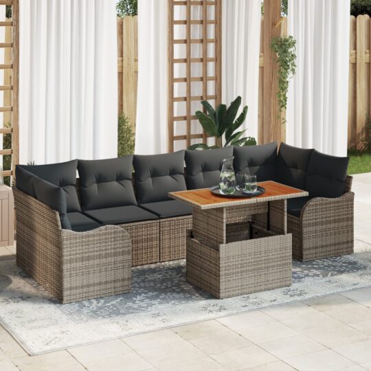 • Componente incluse: Setul ăsta vine cu o masă de grădină adaptabilă, două canapele cu brațe, două scaune de colț și trei scaune centrale, toate gândite pentru maxim de confort. Fiecare piesă are depozitare integrată pentru a ține lucrurile în ordine.