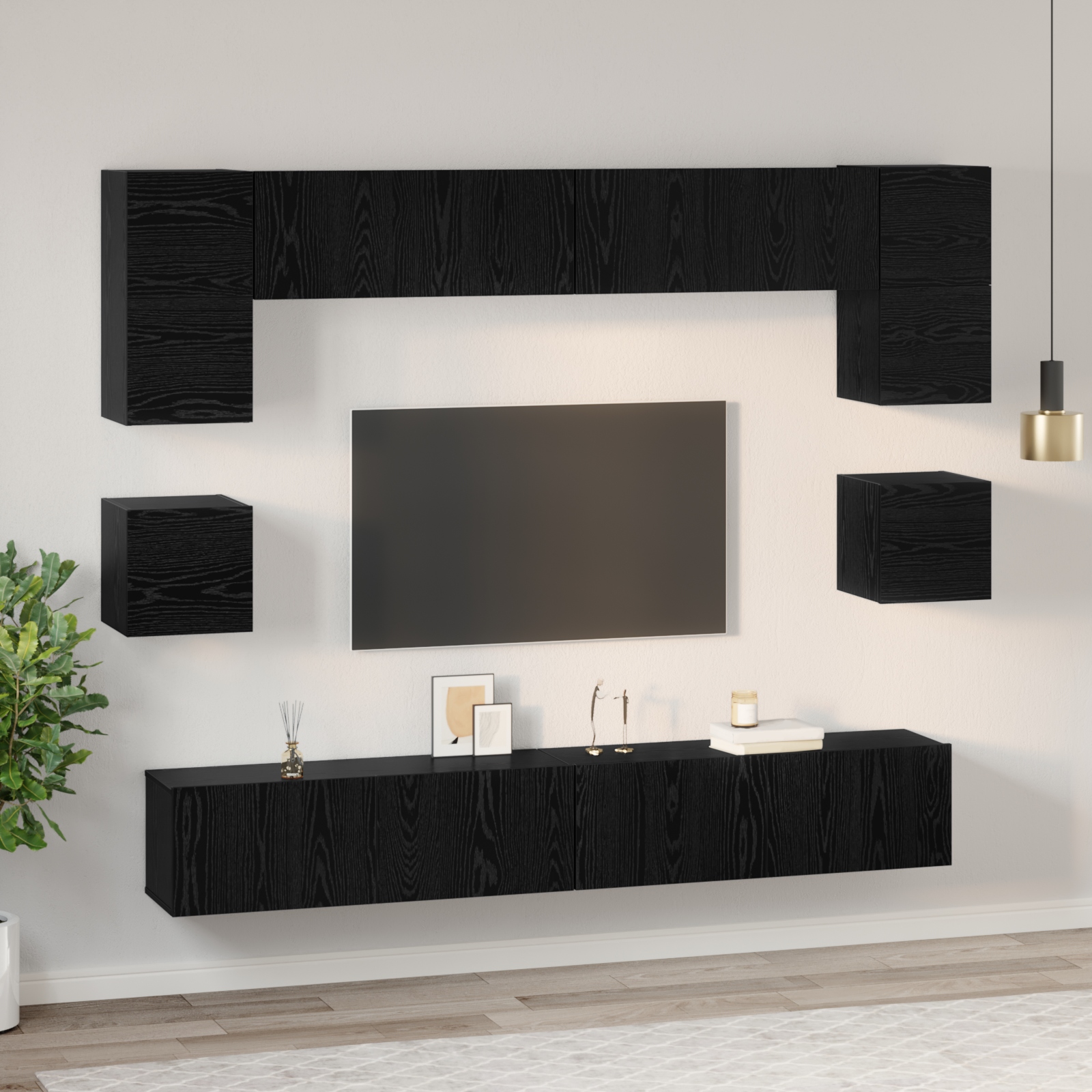 Setul ăsta de dulap pentru TV montat pe perete e exact ce ai nevoie pentru o cameră de zi modernă. Oferă un design sleek care se concentrează pe simplitate și utilitate. Forma lui dreptunghiulară și textura rustică se potrivesc perfect cu un interior contemporan. Dulapul ăsta pentru TV combină stilul cu depozitarea inteligentă, ajutându-te să ții totul în ordine și mai puțin aglomerat.