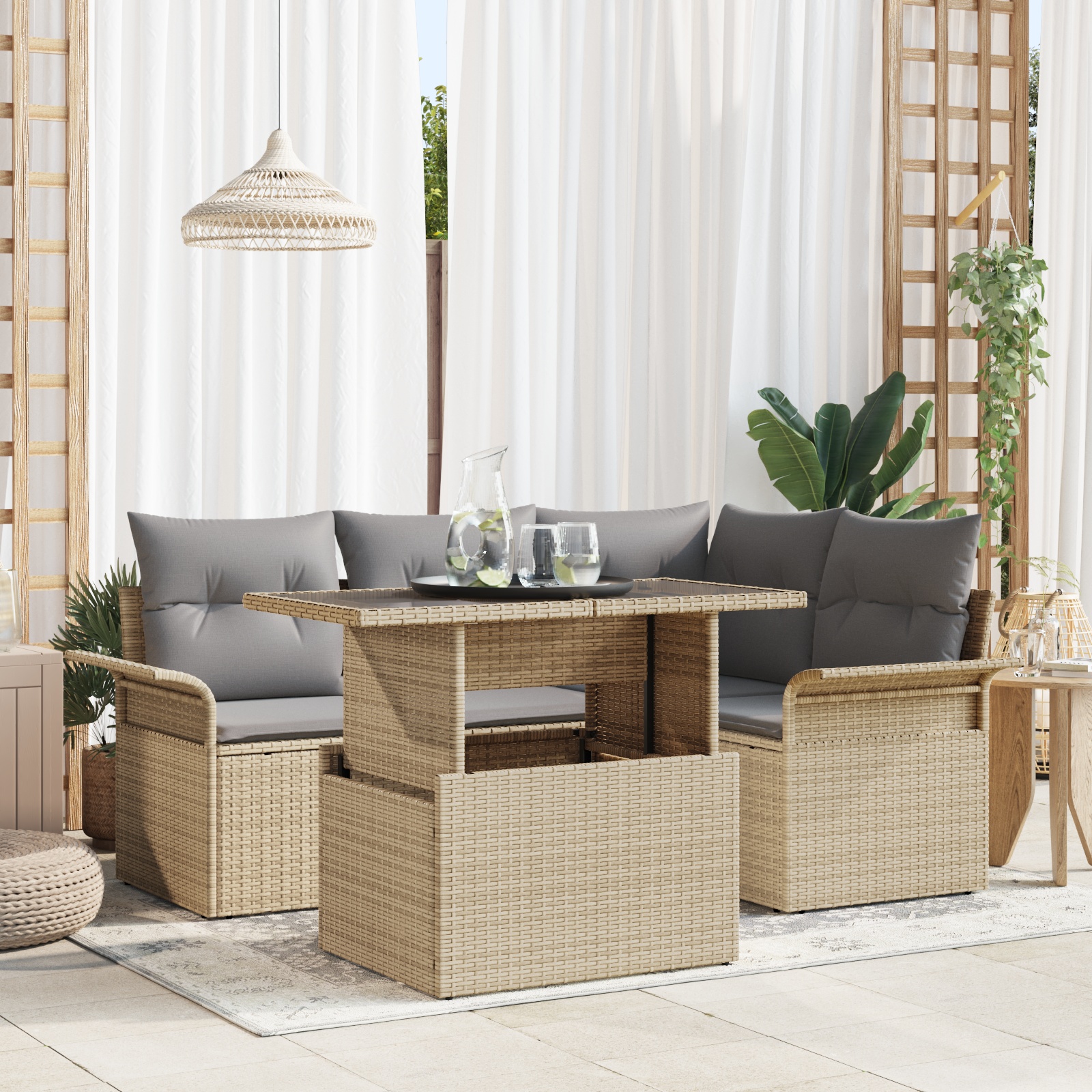 - Materiale: Fabricat din poliratan, setul are un cadru din oțel vopsit, care e atât rezistent, cât și arătos. Poliratanul suportă vremea, păstrându-și aspectul fain pe tot parcursul anului.
