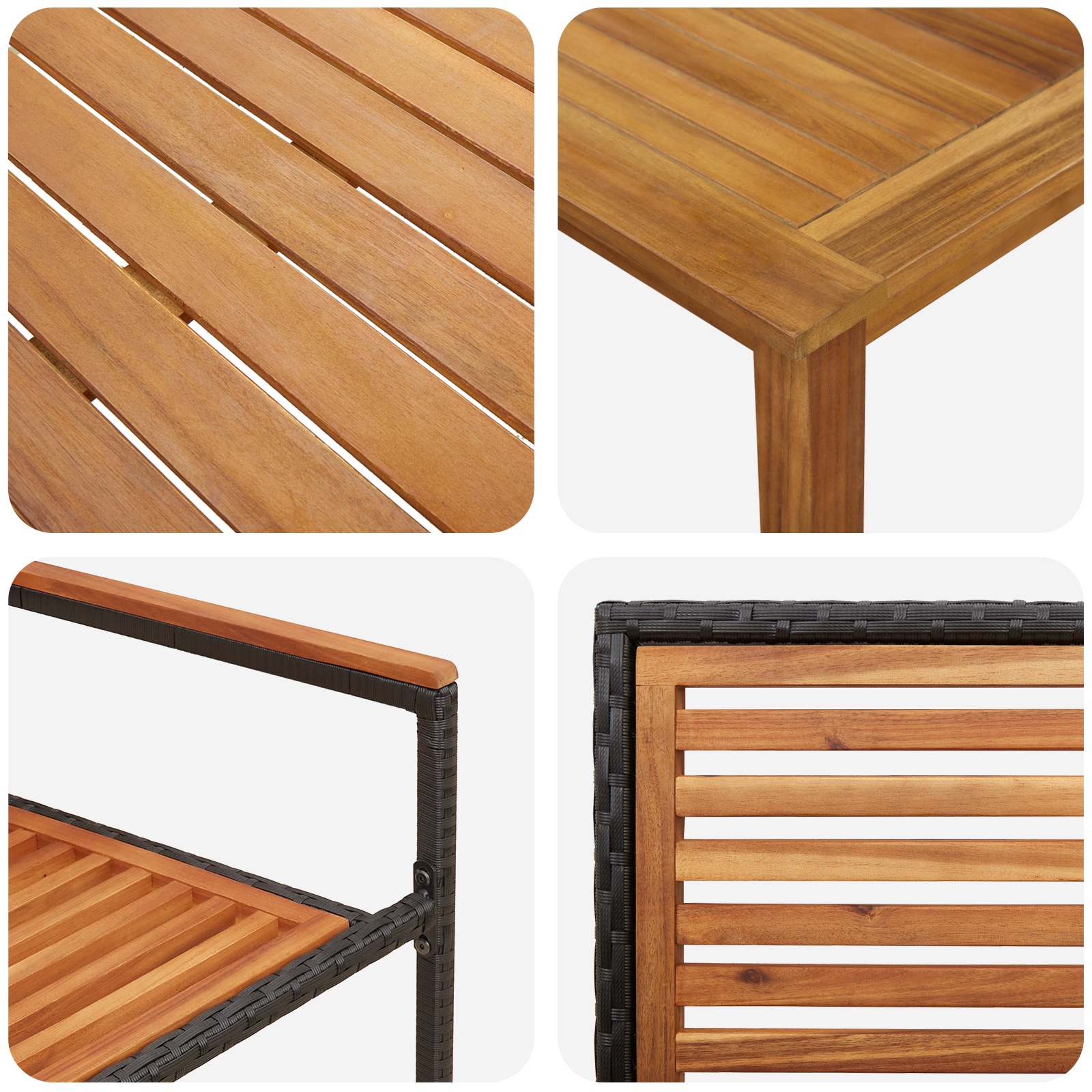 • Componente Funcționale Setul include o masă rectangulară, scaune cu șezuturi și spătare din lemn solid de acacia și brațe din poliratan, fiecare lucrat cu atenție la detalii. Aceste componente de înaltă calitate oferă confort și durabilitate, făcând din experiența de a mânca sau de a te relaxa afară una plăcută.