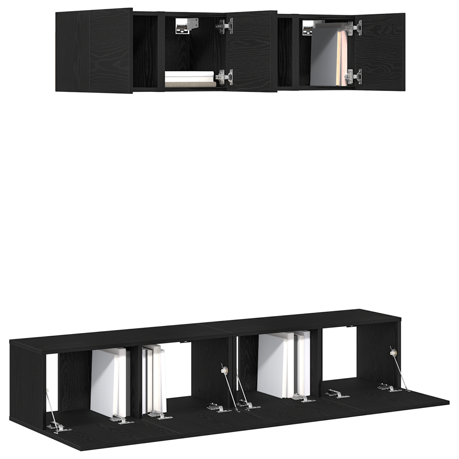 Îndulcește-ți livingul cu setul de 6 piese de cabinet TV într-un finisaj super frumos din stejar negru. Această opțiune montată pe perete îmbină stilul cu utilitatea, fiind perfectă pentru orice cămin modern.