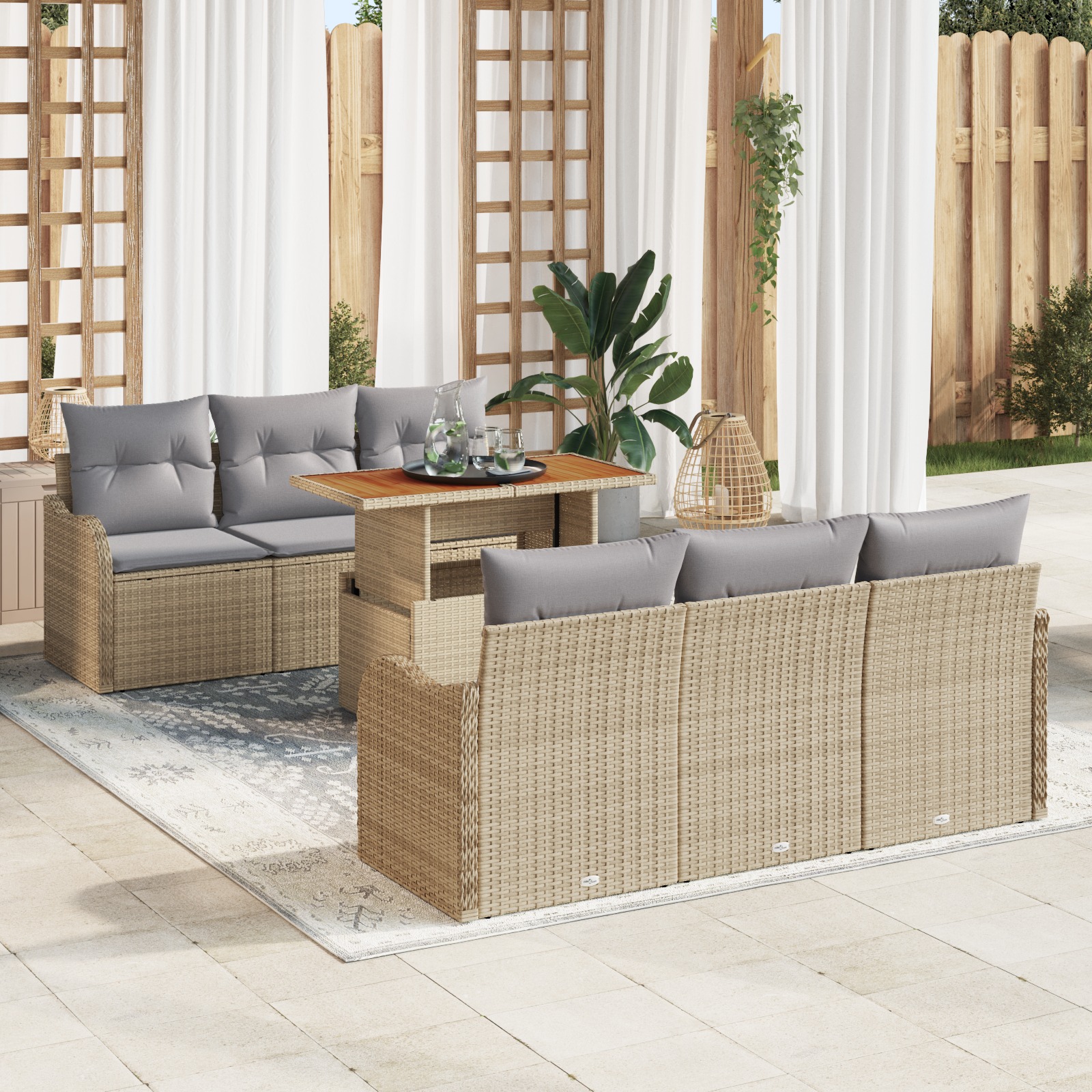 • Materiale: Setul de canapea pentru grădină e fabricat din poliratan de calitate și un cadru din oțel vopsit electrostatic, combinând eleganța cu rezistența. Aceste materiale nu doar că rezistă vremii, dar arată și fain. Suprafața din lemn de acacia adaugă un pic de confort și scoate în evidență frumusețea spațiului tău exterior.