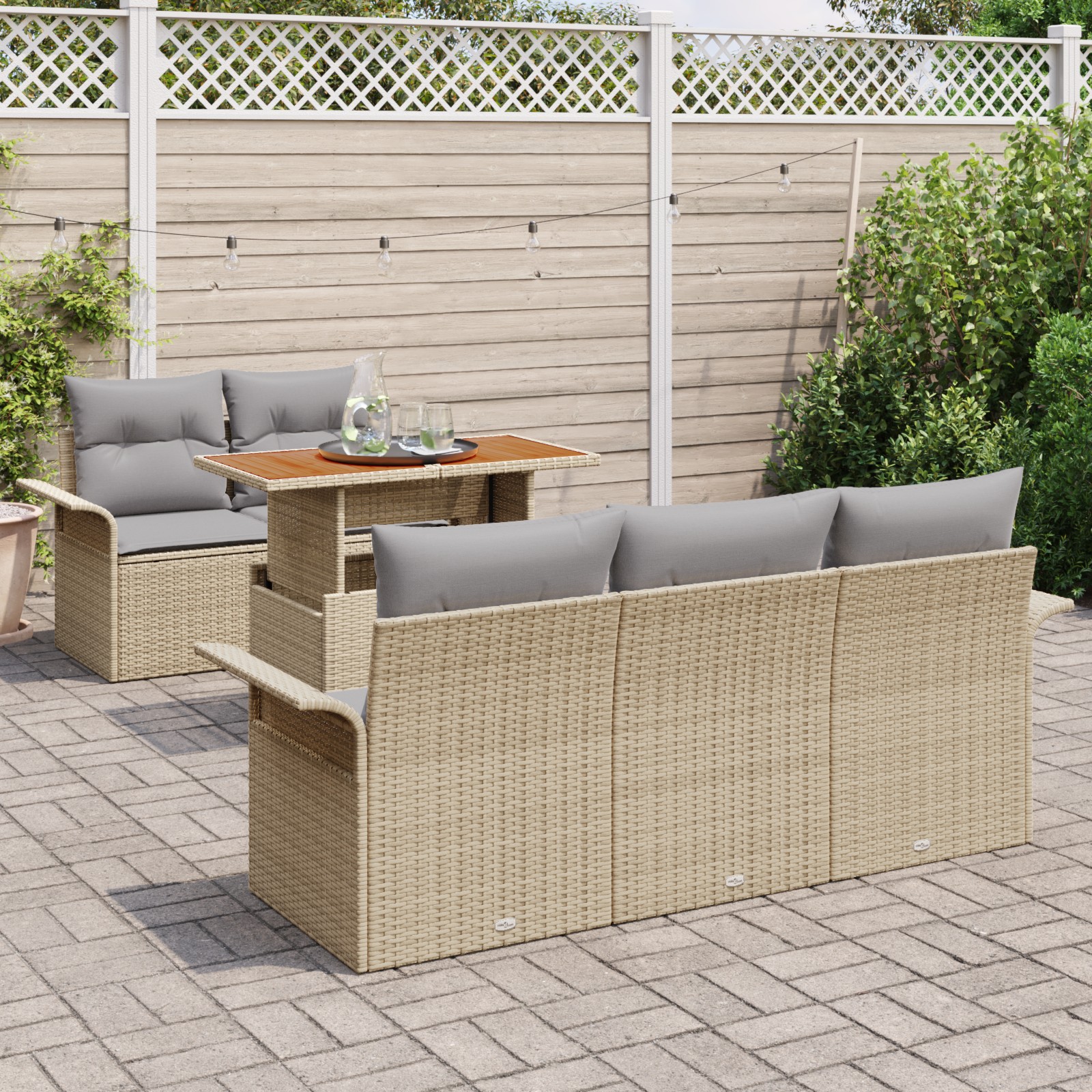 - Componente Incluse: Fiecare piesă din setul de canapea are cotieră și spătar din poliratan, combinate cu perne confortabile pentru exterior. Masa de grădină, realizată din lemn masiv de acacia, servește drept piesă centrală perfectă, oferind atât stil, cât și funcționalitate. Funcțiile de depozitare în brațul și celelalte locuri centrale oferă un spațiu organizat pentru perne sau esențiale de grădină, sporind utilitatea și conveniența.