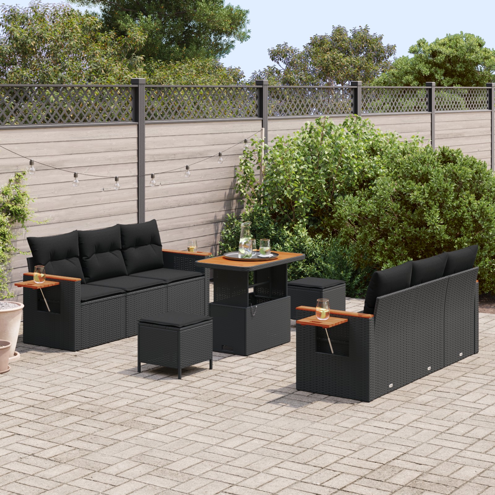 - Componente incluse: Setul are o mulțime de locuri de șezut: patru fotolii cu brațe, două scaune centrale și două taburete pătrate. Poți modifica aranjamentul pentru a se potrivi grupului tău. Plus, e inclusă și o masă asortată care face zona perfectă pentru relaxare sau servit masa.