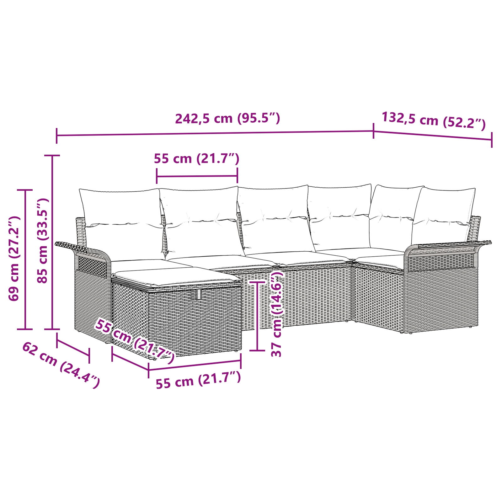 • Funcții modulare: Designul modular îți oferă tons de opțiuni de aranjare, de la setări mari pentru grupuri numeroase, la aranjamente cozy pentru discuții relaxante. Flexibilitatea asta îl face ideal pentru grădini și terase, lăsându-te să-l ajustezi cum îți place.
