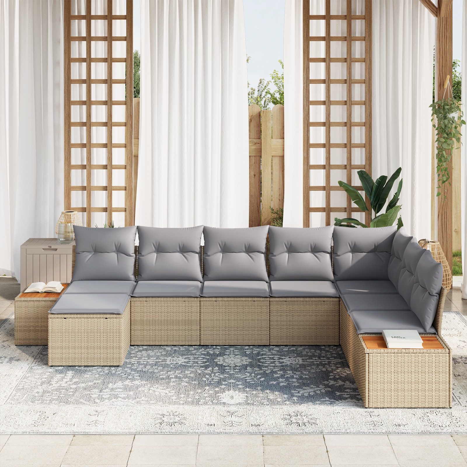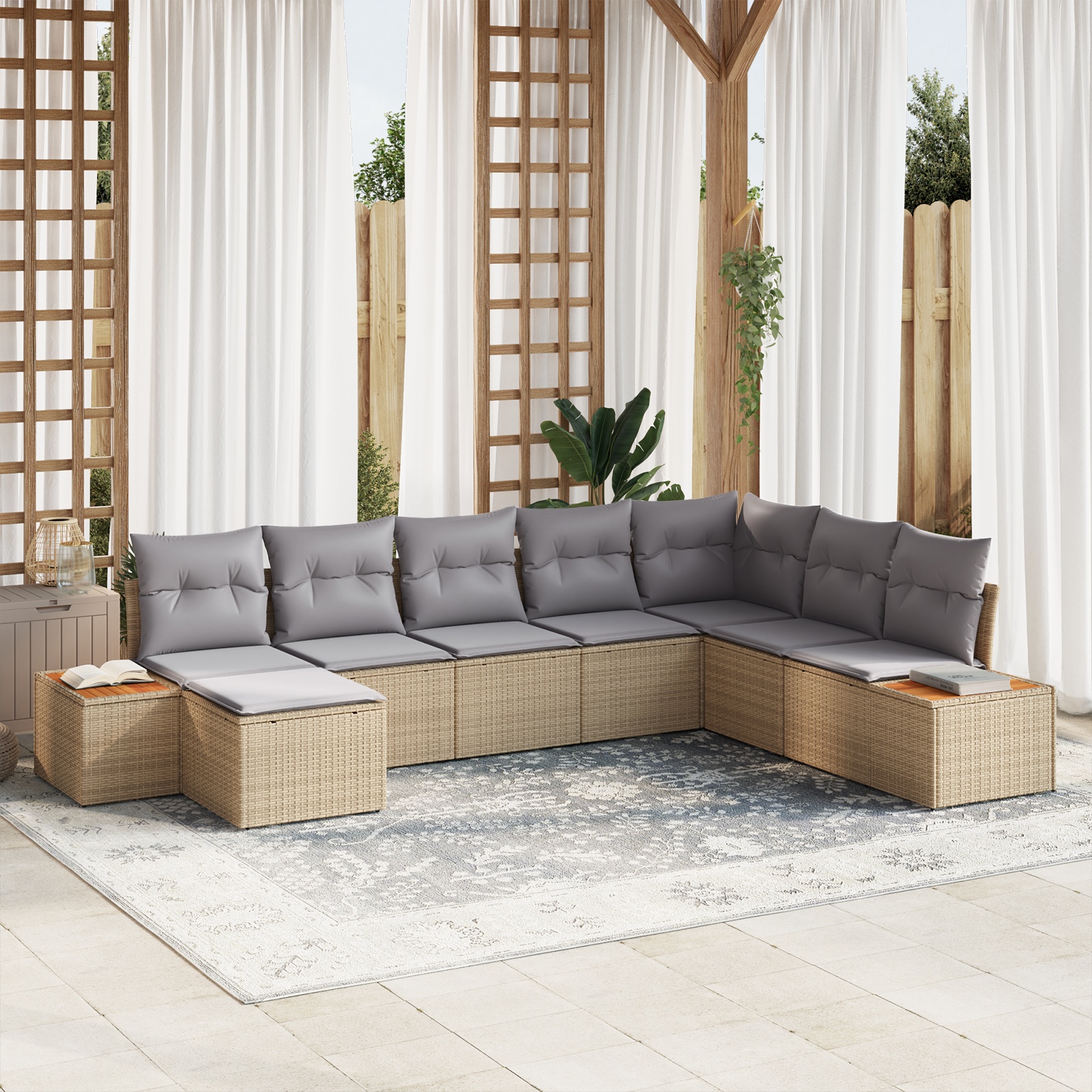 Acest set de canapea de grădină îmbină designul modern cu funcționalitatea mare, aducând un vibe elegant în orice exterior. Liniile lui elegante și setup-ul modular îți permit să aranjezi locurile cum îți place, perfect pentru orice terasă sau grădină. Cu un layout confortabil, acest set de exterior e ideal pentru cei care iubesc stilul și relaxarea, creând o atmosferă primitoare, perfectă pentru socializare sau pur și simplu pentru a te destinde sub cerul instelat.