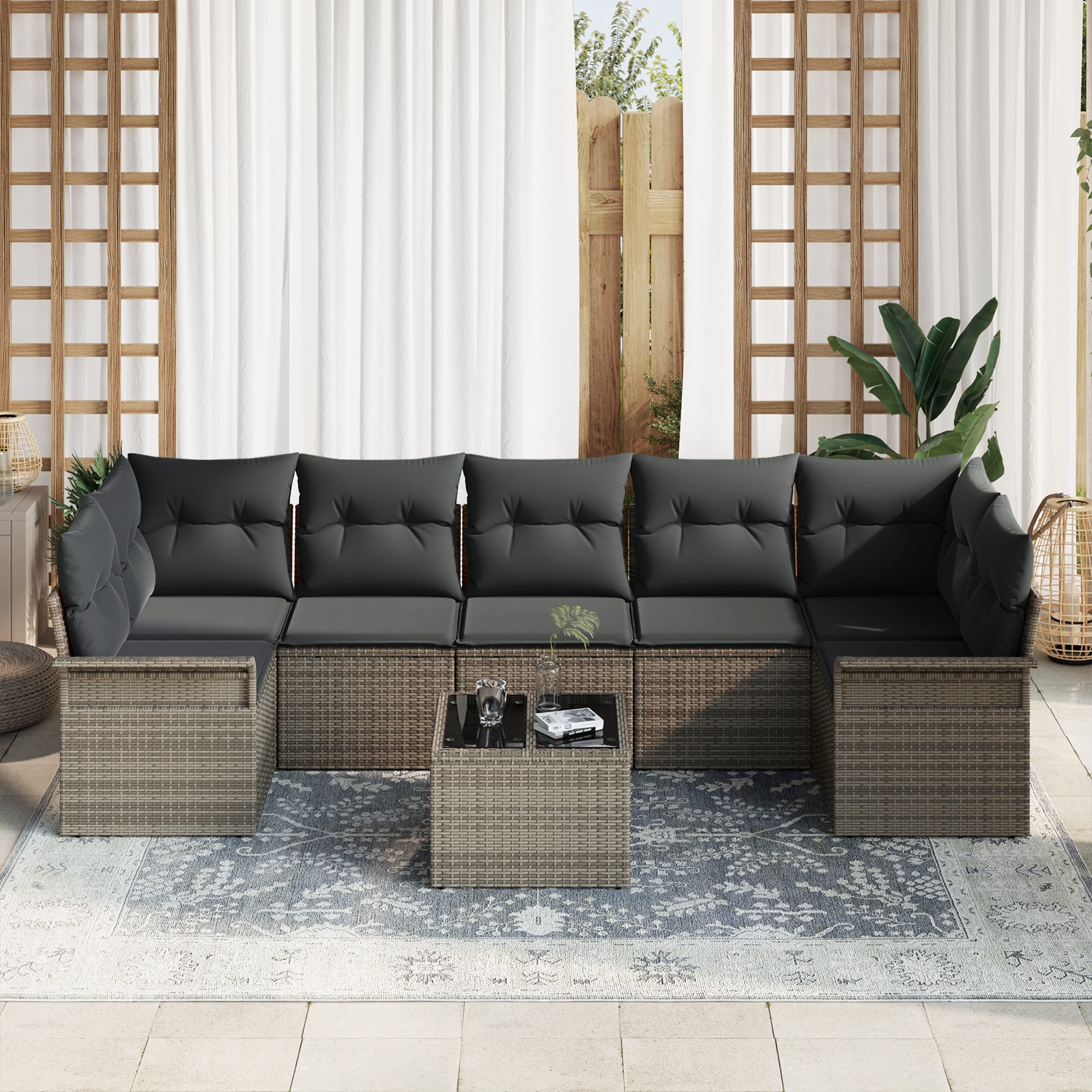Setul ăsta de canapea pentru grădină aduce un vibe fain oricărui spațiu exterior, gândit să-ți ofere flexibilitate și un stil modern. E modular, perfect să-ți ofere multiple opțiuni de șezut, integrându-se ușor în locuri variate, de la terase cozy la petreceri mari în grădină. Designul simplu și neutru creează o atmosferă relaxantă, unde poți să te destinzi, să te distrezi sau pur și simplu să te bucuri de vreme. Se potrivește atât la întâlniri mici, cât și la petreceri mai mari, asigurând confort și stil.