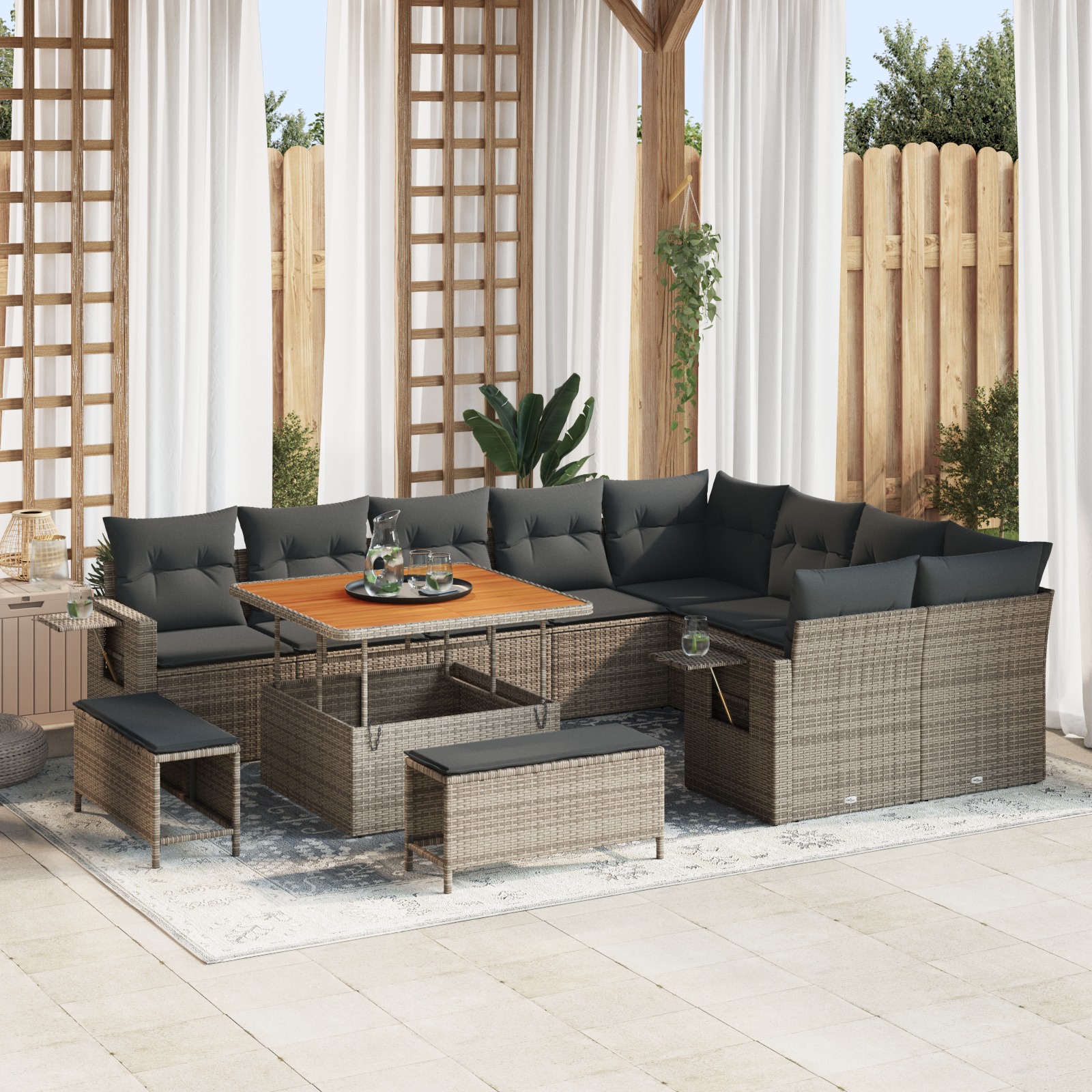 Setul de canapea pentru grădină îmbină stilul cu confortul, aducând un upgrade fain pentru spațiul tău exterior. Formele moderne și textura împletită îl fac foarte inviting, integrându-se perfect în grădini sau pe terase. Perfect pentru a savura cafeaua de dimineață sau pentru a organiza un barbecue de vară, acest set are un farmec vizual și un vibe confortabil, asigurându-se că te distrezi pe cinste afară.